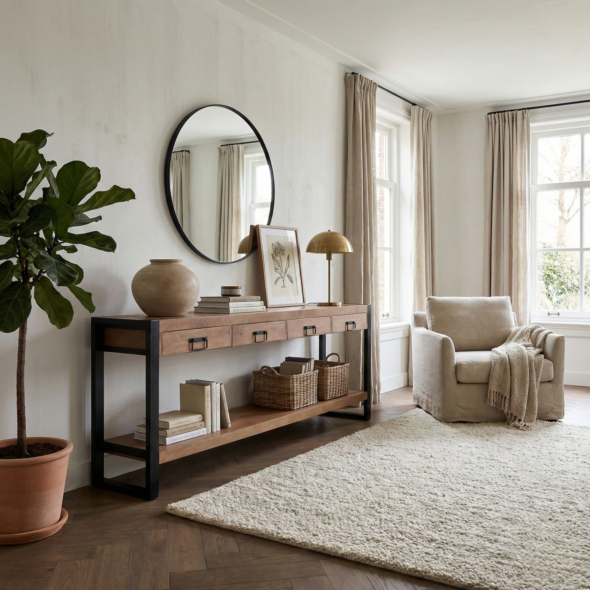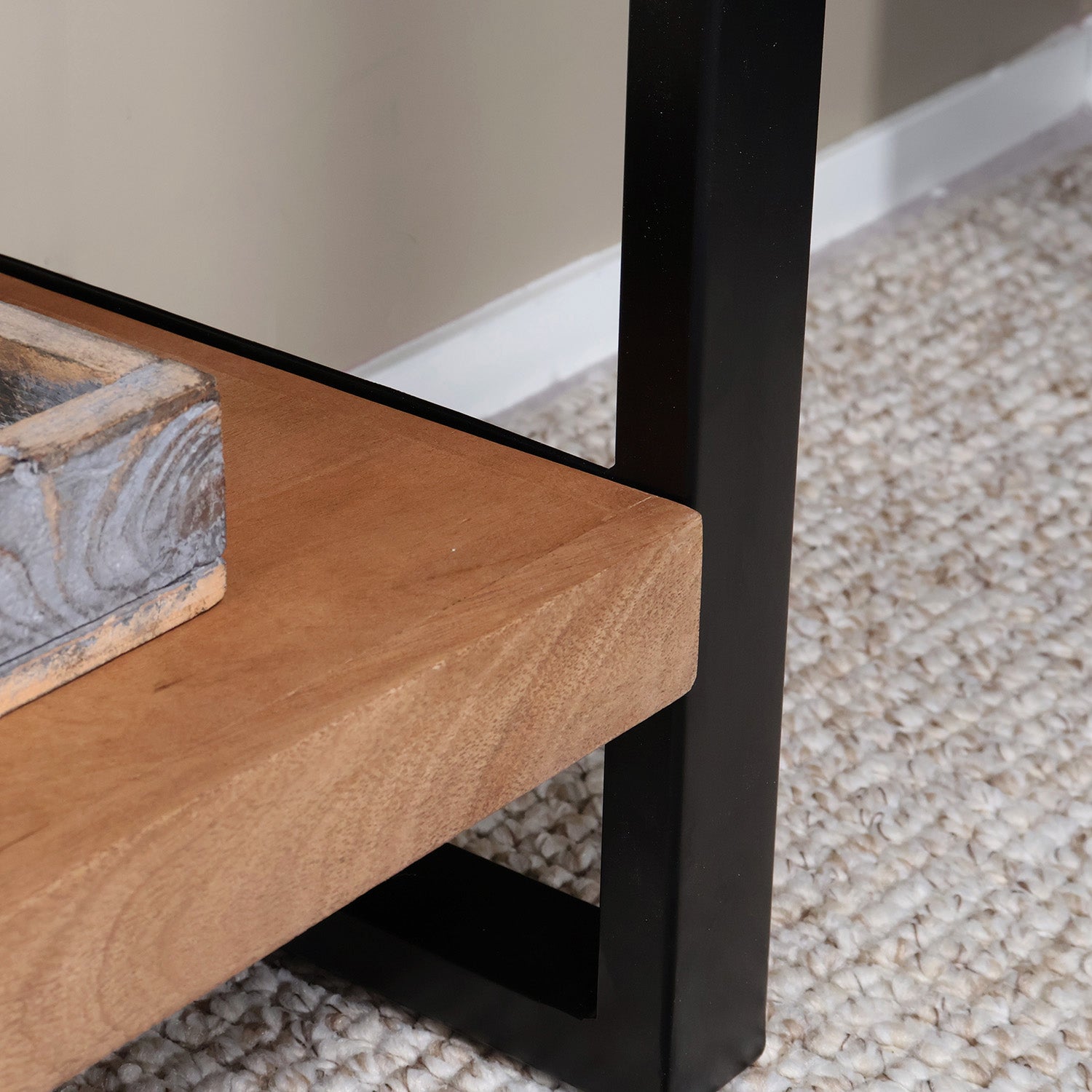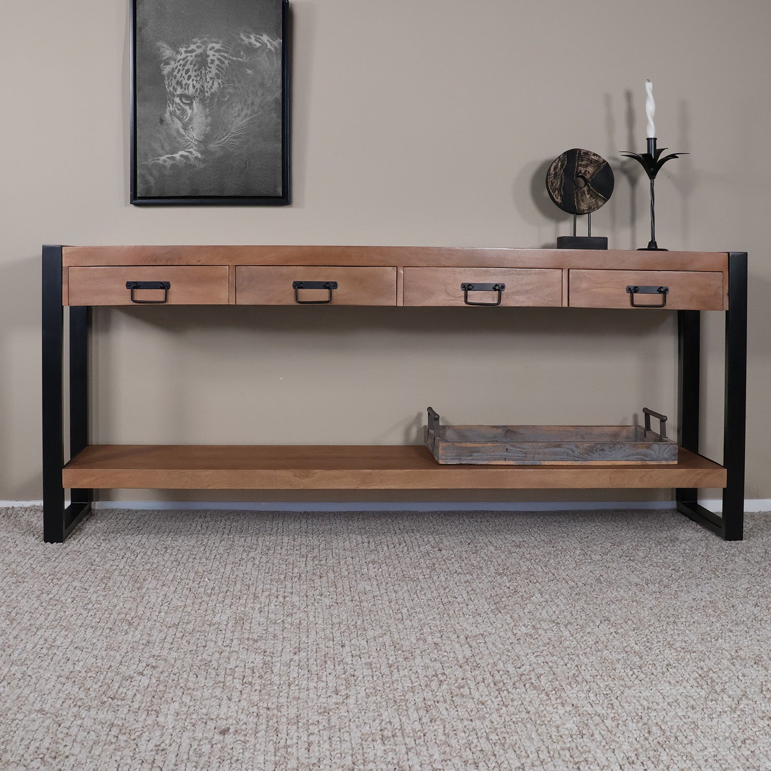 Combineer stijl en functionaliteit met deze ruime bijzettafel. Het natuurlijke houten blad en het metalen frame vormen samen een robuuste en moderne combinatie, terwijl de vier lades en de plank volop opbergruimte bieden. Een veelzijdig meubel dat sfeer én praktisch gemak toevoegt aan elke kamer.