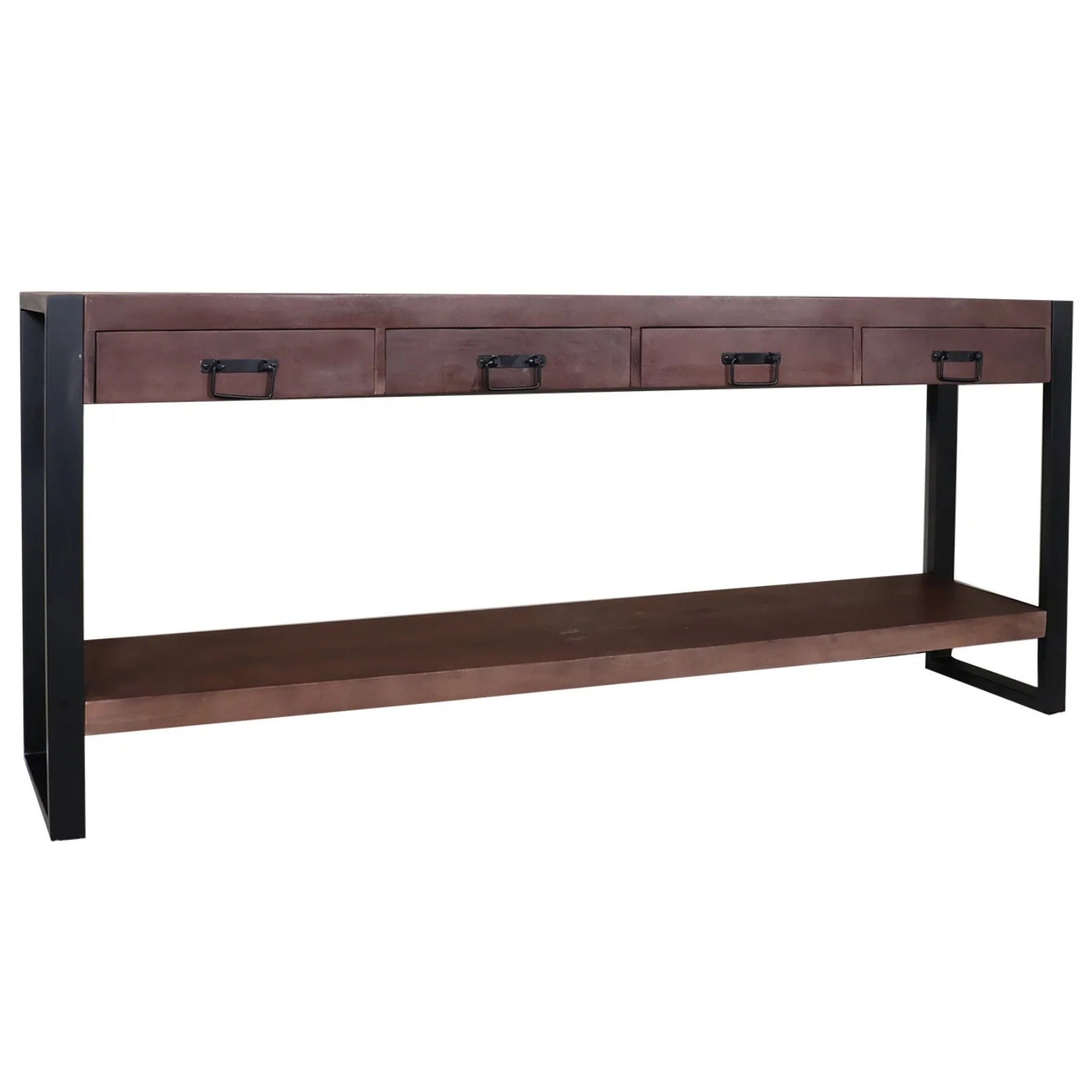 Combineer stijl en functionaliteit met deze ruime bijzettafel. Het natuurlijke houten blad en het metalen frame vormen samen een robuuste en moderne combinatie, terwijl de vier lades en de plank volop opbergruimte bieden. Een veelzijdig meubel dat sfeer én praktisch gemak toevoegt aan elke kamer.
