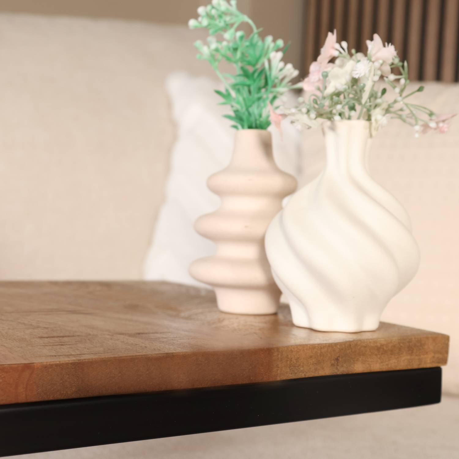 Doordat mangohout een beetje golft, is de hoogte van de bijzettafel een circa maat. De maten van het frame zijn altijd vast, maar qua hoogte kan de laptoptafel maximaal één centimeter variëren.