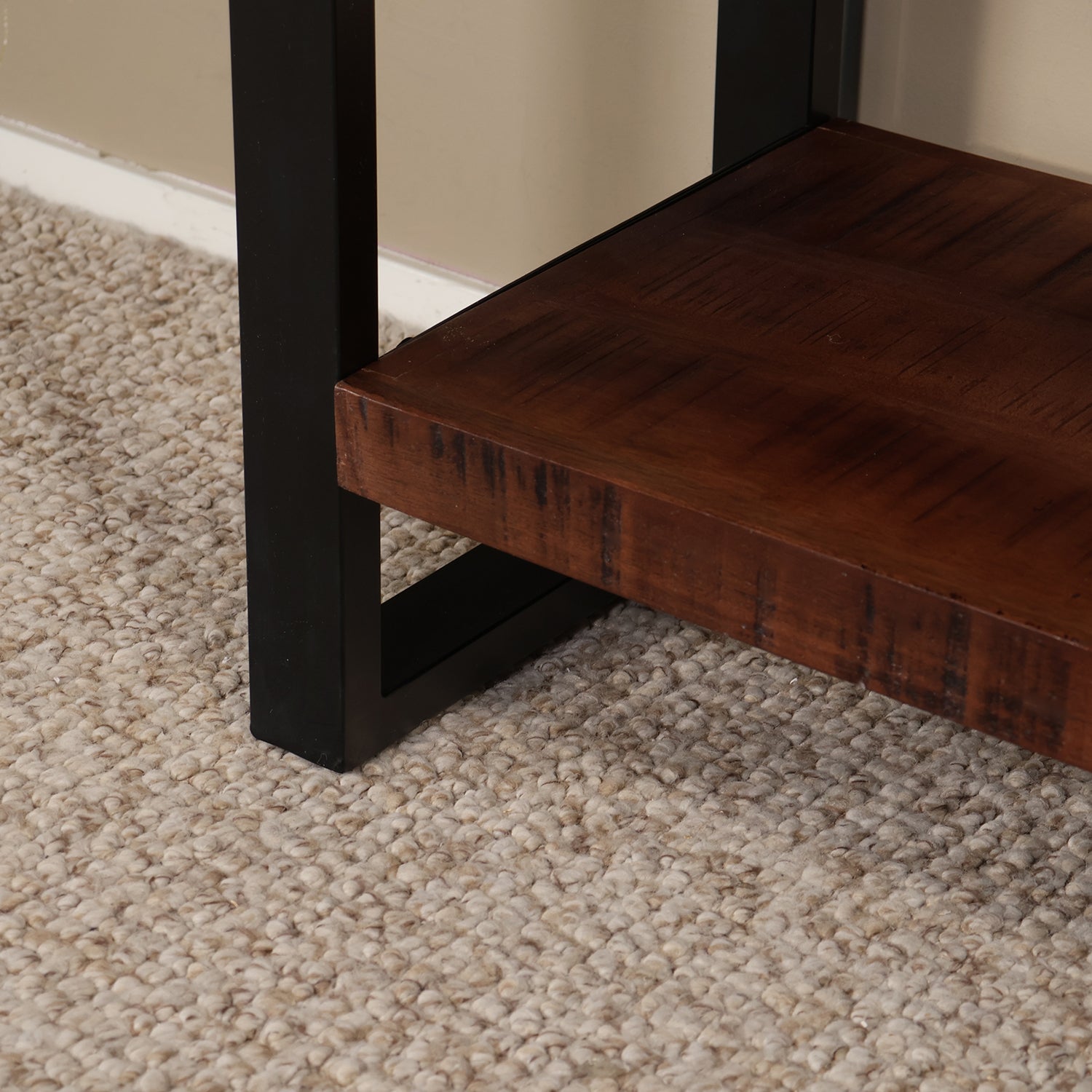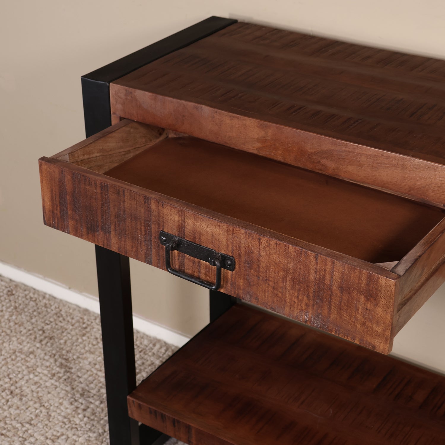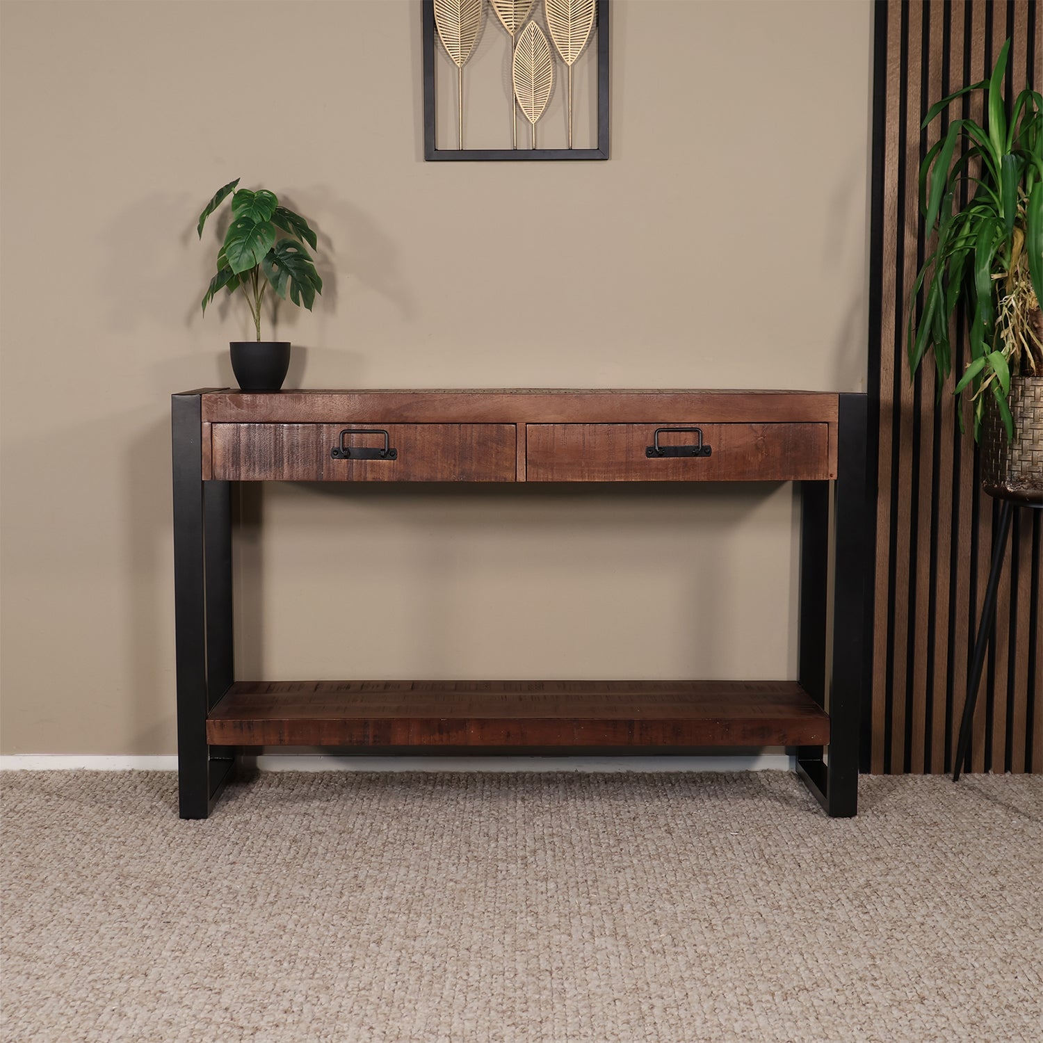 Geef je interieur een warme, stijlvolle uitstraling met deze praktische bijzettafel. Het massieve houten blad en het metalen frame vormen samen een stoer geheel, terwijl de lades en de plank zorgen voor handige opbergruimte. Een veelzijdig meubel dat in elke ruimte goed tot zijn recht komt.