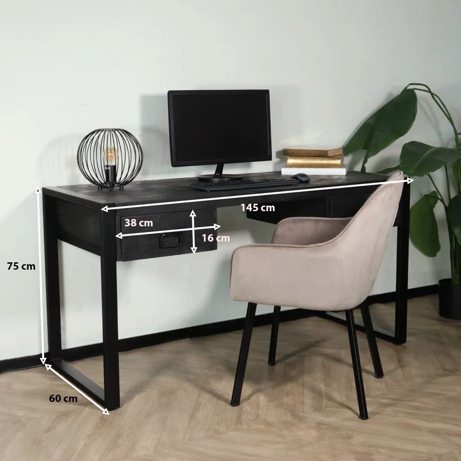 Dit bureau heeft een mangohouten blad, twee houten lades en een zwart metalen onderstel. Bij mangohout weet je zeker dat het hout een duurzame oorsprong heeft en dat het duurzaam is! Mangobomen worden namelijk niet speciaal gekweekt voor het hout, maar juist voor de mango's die eraan groeien. Als een mangoboom te oud is voor de mangoteelt, dan pas wordt hij gekapt om plaats te maken voor een jongere boom. De gekapte boom wordt dan gebruikt om meubelen van te maken.