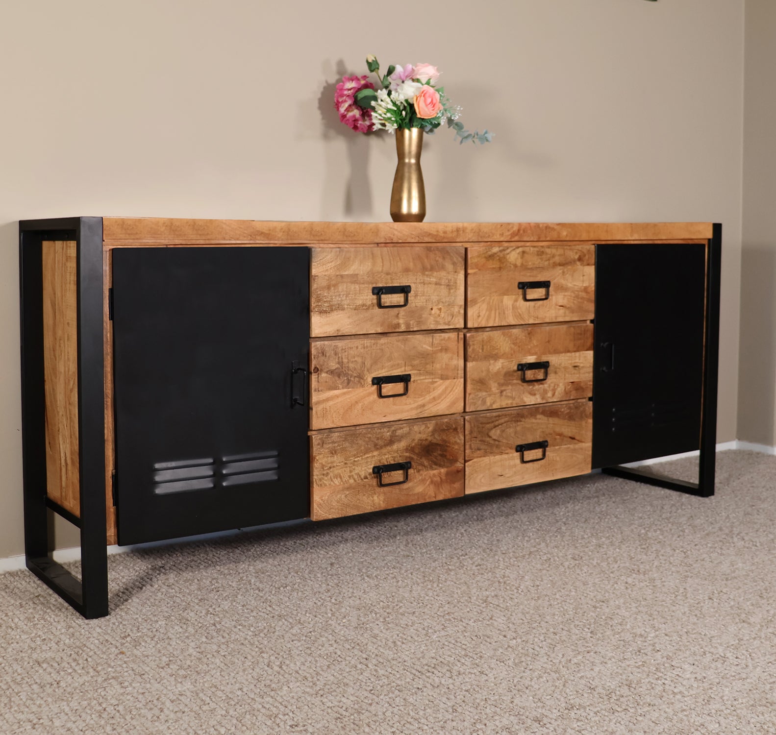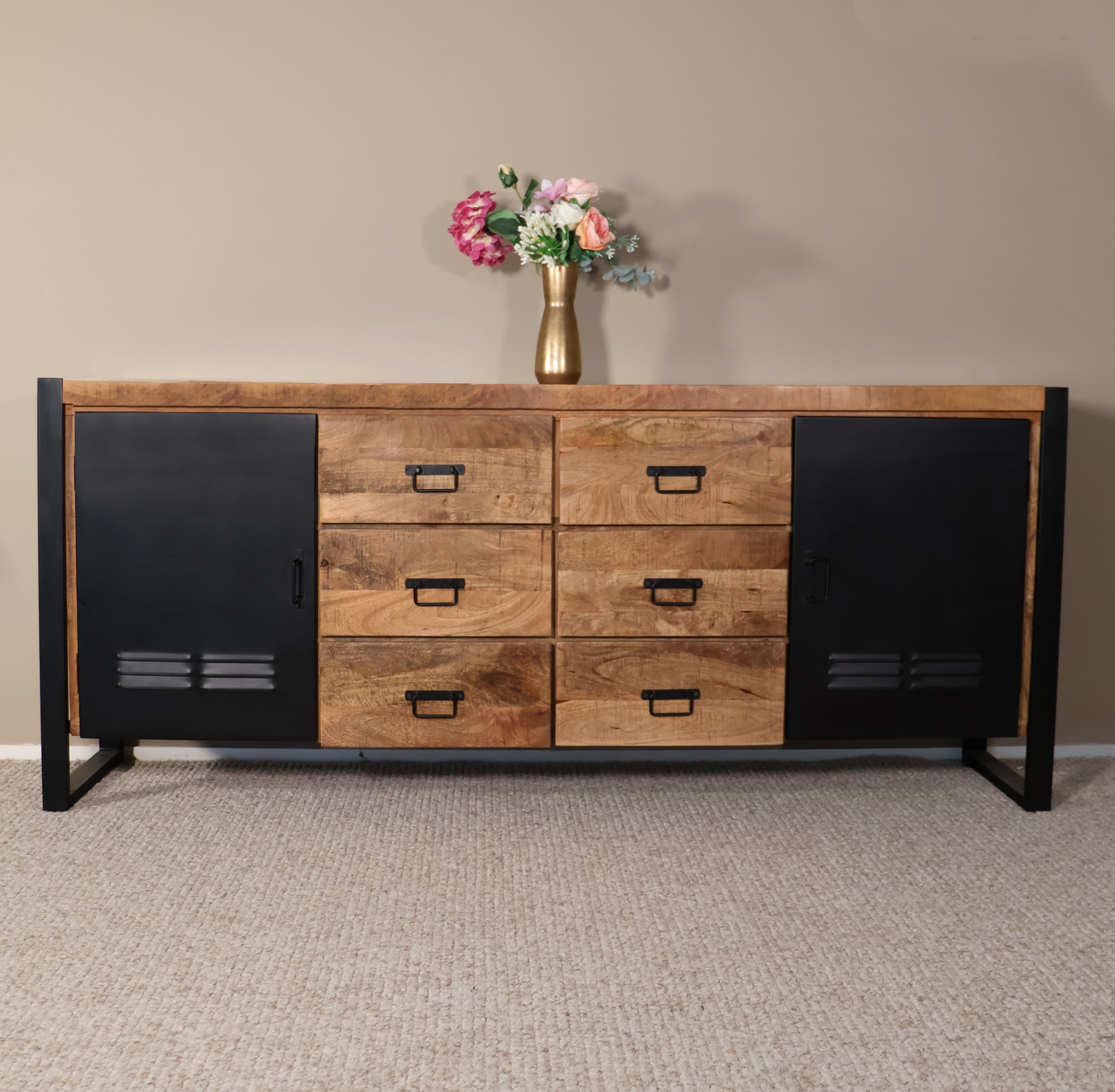 Creëer een warme en stoere sfeer in huis met dit robuuste dressoir. Het natuurlijke hout in combinatie met het metalen frame geeft dit meubel een industriële look, terwijl de ruime lades en kastdeuren voldoende opbergruimte bieden voor al je spullen. Perfect als dressoir, tv-meubel of stijlvol wandmeubel in de woonkamer.