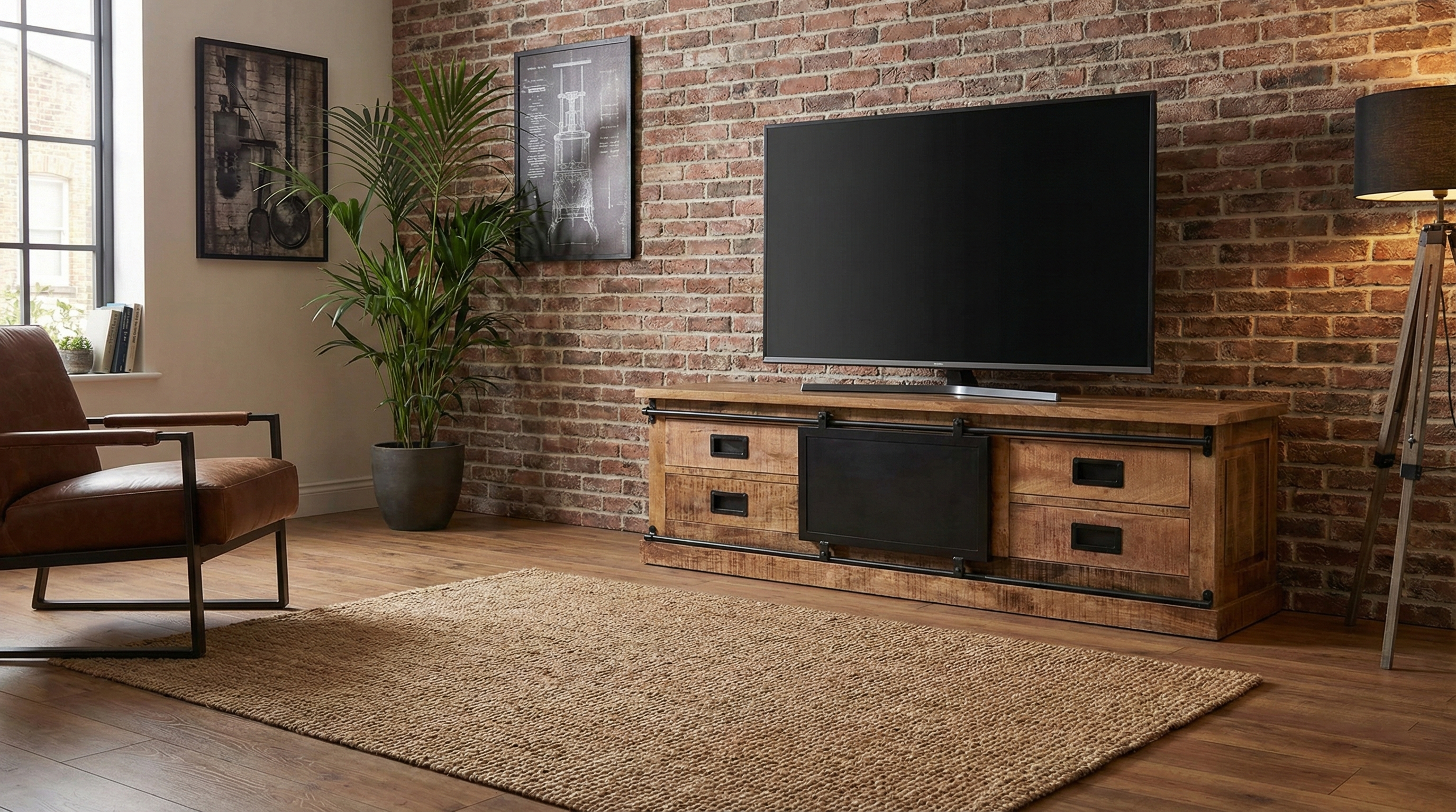 Geef je interieur een stoere, industriële uitstraling met dit robuuste dressoir. Het natuurlijke hout en de metalen accenten vormen een perfecte balans tussen warmte en karakter. Dankzij de lades, open vakken en schuifdeur biedt dit wandmeubel volop opbergruimte voor boeken, accessoires en elektronica — ideaal als tv-meubel of stijlvolle opbergkast.