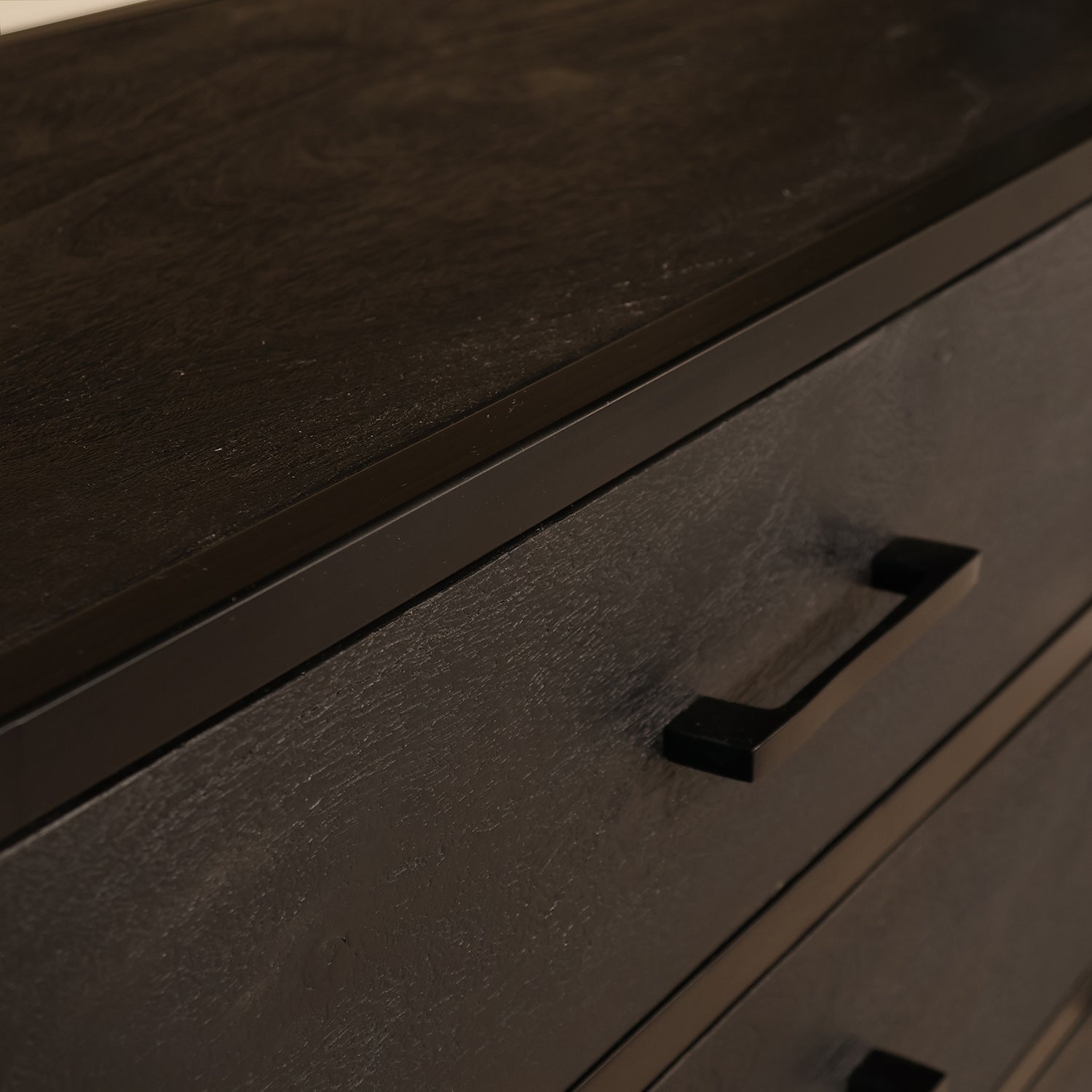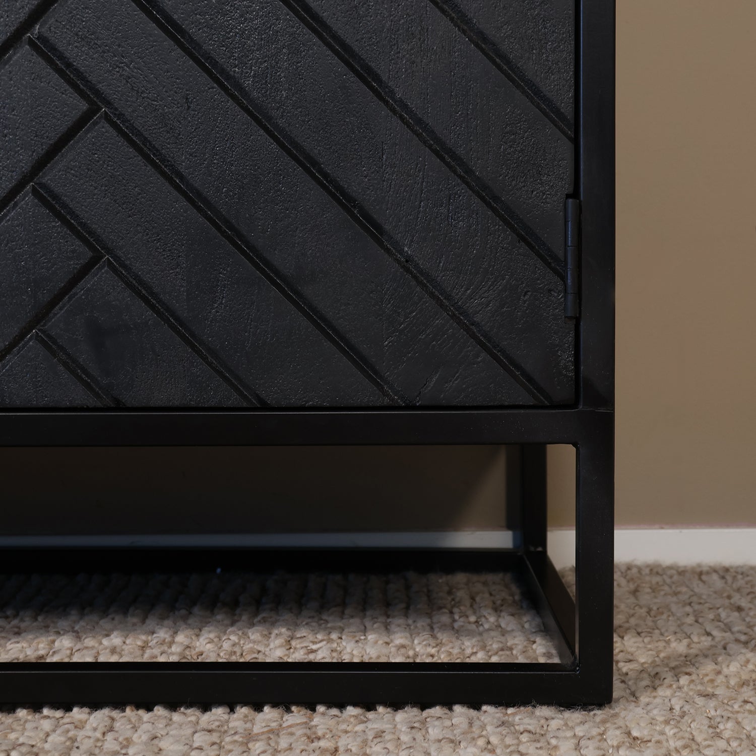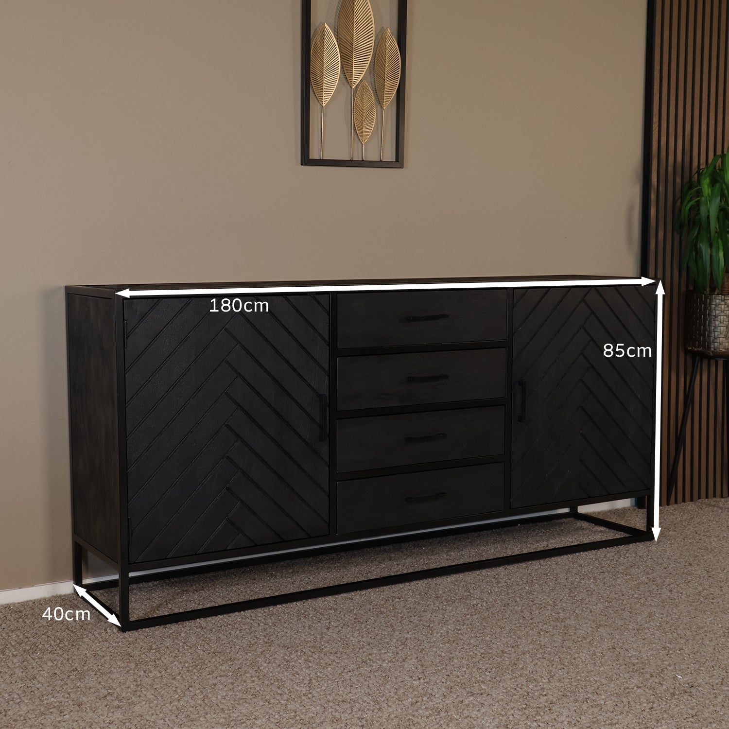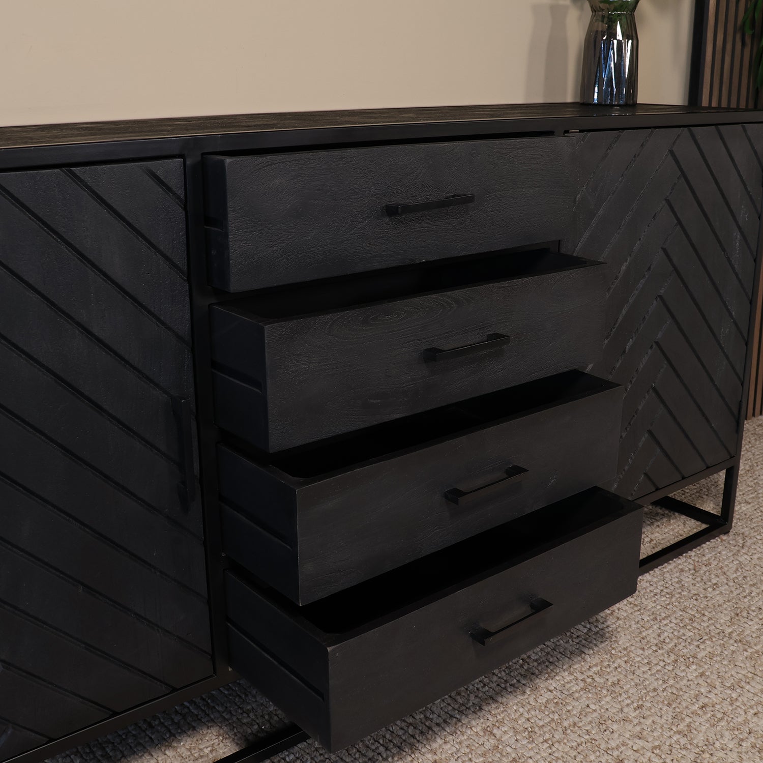 Geef je interieur een luxe en stoere uitstraling met dit prachtige dressoir. Het warme hout met visgraatpatroon en het metalen frame vormen samen een perfect evenwicht tussen elegantie en industrieel design. Met ruime lades en kastdeuren biedt dit meubel voldoende opbergruimte, terwijl het bovenblad ideaal is voor decoratie of je televisie.