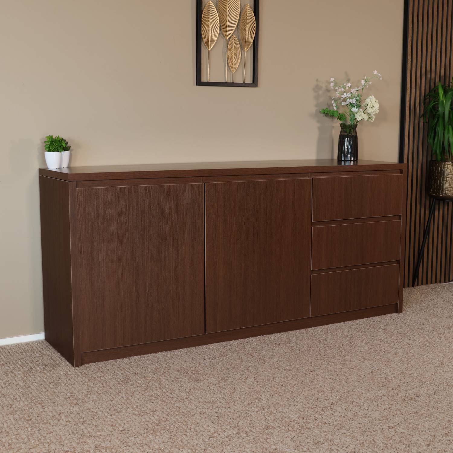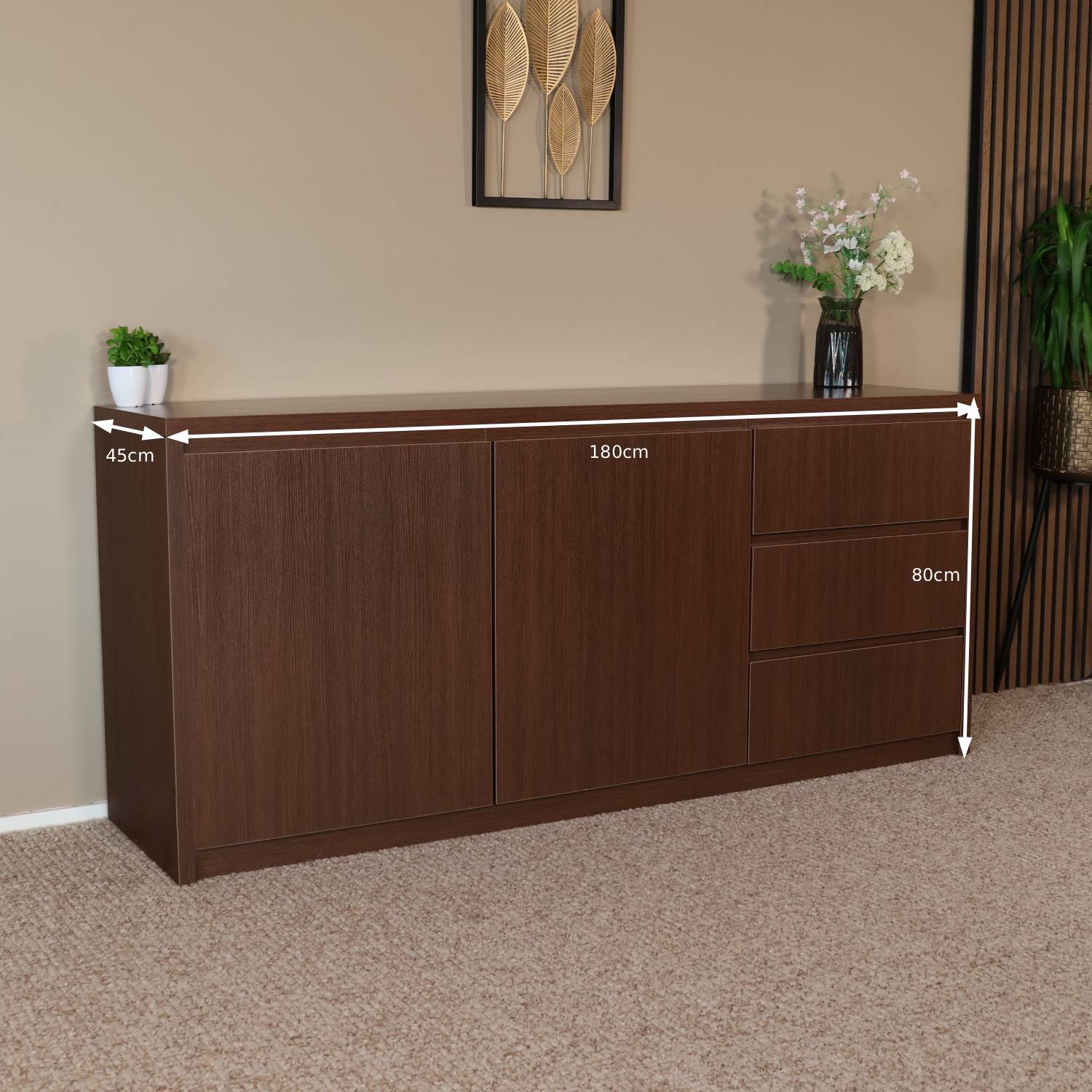 Voeg een stijlvolle en moderne touch toe aan je interieur met dit ruime dressoir. De houtlook melamine afwerking zorgt voor een strak en tijdloos design. Met twee deuren en drie lades biedt dit meubel volop opbergruimte voor al je woonaccessoires en elektronica, terwijl het bovenblad ideaal is voor decoratie of je televisie.