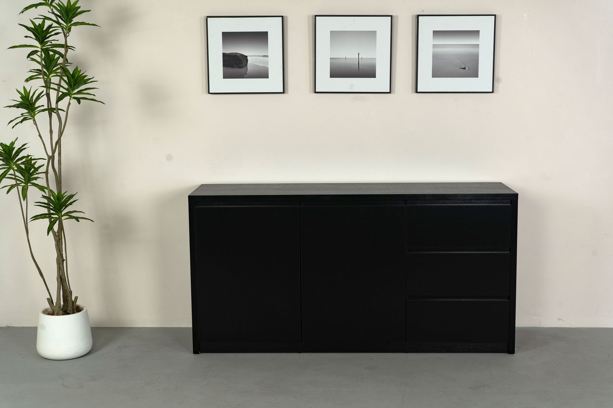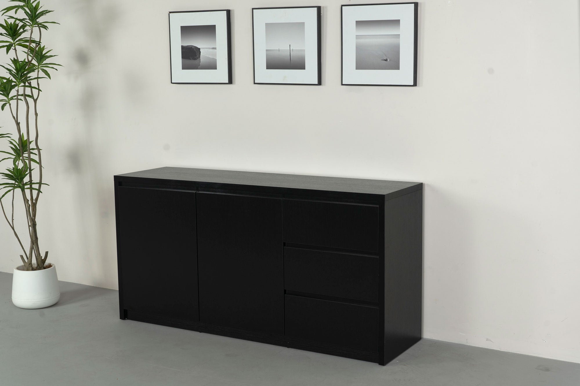 Het melamine dressoir Cassie is voorzien van twee zwarte deuren en drie lades waar je diverse spullen in of achter kan opbergen om deze uit het zicht maar toch binnen handbereik te houden! Denk hierbij bijvoorbeeld aan de opladers van je telefoon of laptop, je tablet of fotocamera, de controllers van de gameconsole, al jullie gezelschapsspelletjes en andere spullen! Bovenop dressoir kun jij bijvoorbeeld je tv kwijt voor als je deze graag wat hoger hebt staan, maar je hebt ook genoeg ruimte om lekkere geurstokjes, een mooie foto of decoratieve beelden te zetten!