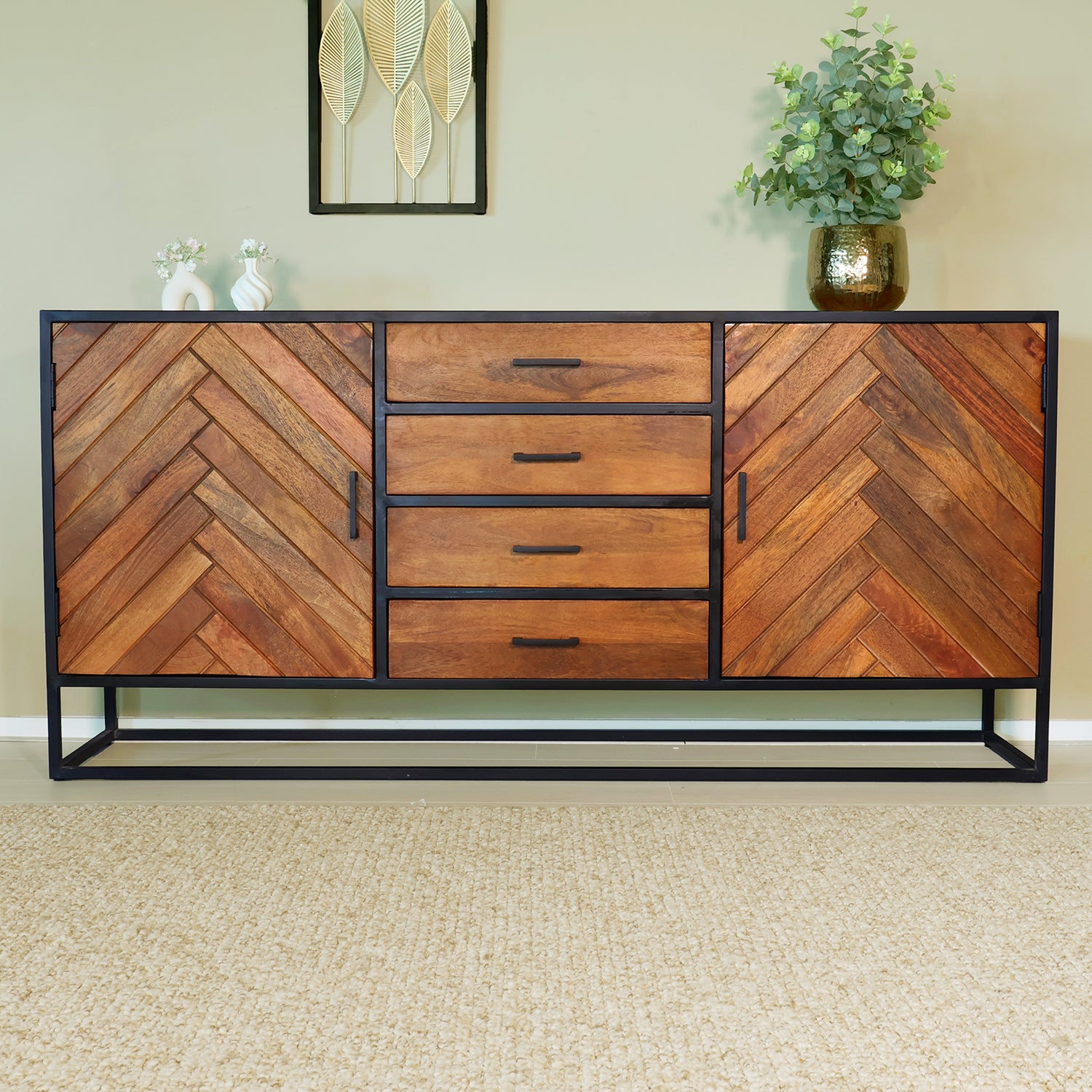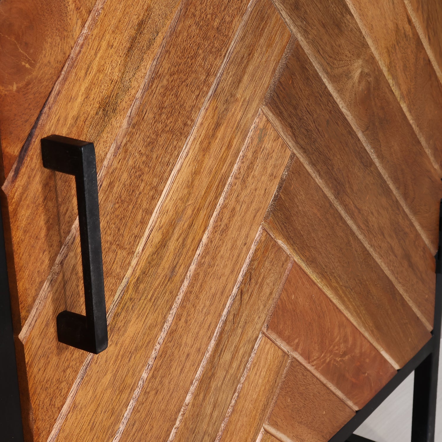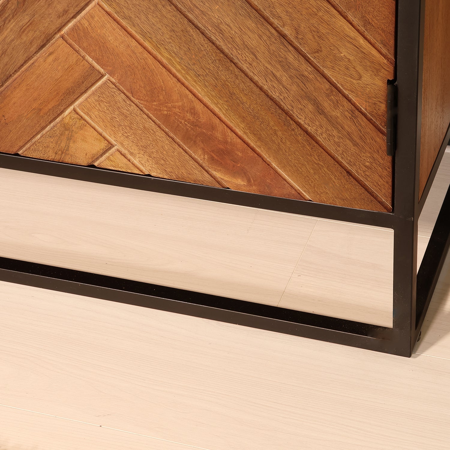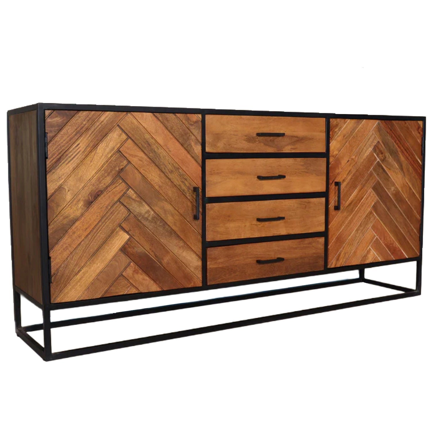 Dit wandmeubel is gemaakt van mangohout met visgraatpatroon en een zwart metalen onderstel. Door de mooie uitstraling en het compacte formaat kun je het dressoir op veel plaatsen kwijt, niet alleen als dressoir maar ook als stoer en industrieel wandmeubel of tv meubel! Bij mangohout weet je zeker dat het hout een duurzame oorsprong heeft en dat het duurzaam is! Mangobomen worden namelijk niet speciaal gekweekt voor het hout, maar juist voor de mango's die eraan groeien. Als een mangoboom te oud is voor de mangoteelt, dan pas wordt hij gekapt om plaats te maken voor een jongere boom. De gekapte boom wordt dan gebruikt om meubelen van te maken, misschien wel jouw nieuwe dressoir! Doordat hout een natuurproduct is, kan het zijn dat jouw meubel een iets andere kleur of vorm heeft dan het meubel op de foto.