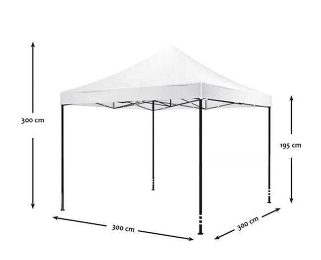 Deze partytent heeft een lengte van 3,00m, een breedte van 3,00m en een hoogte van 3,00m.