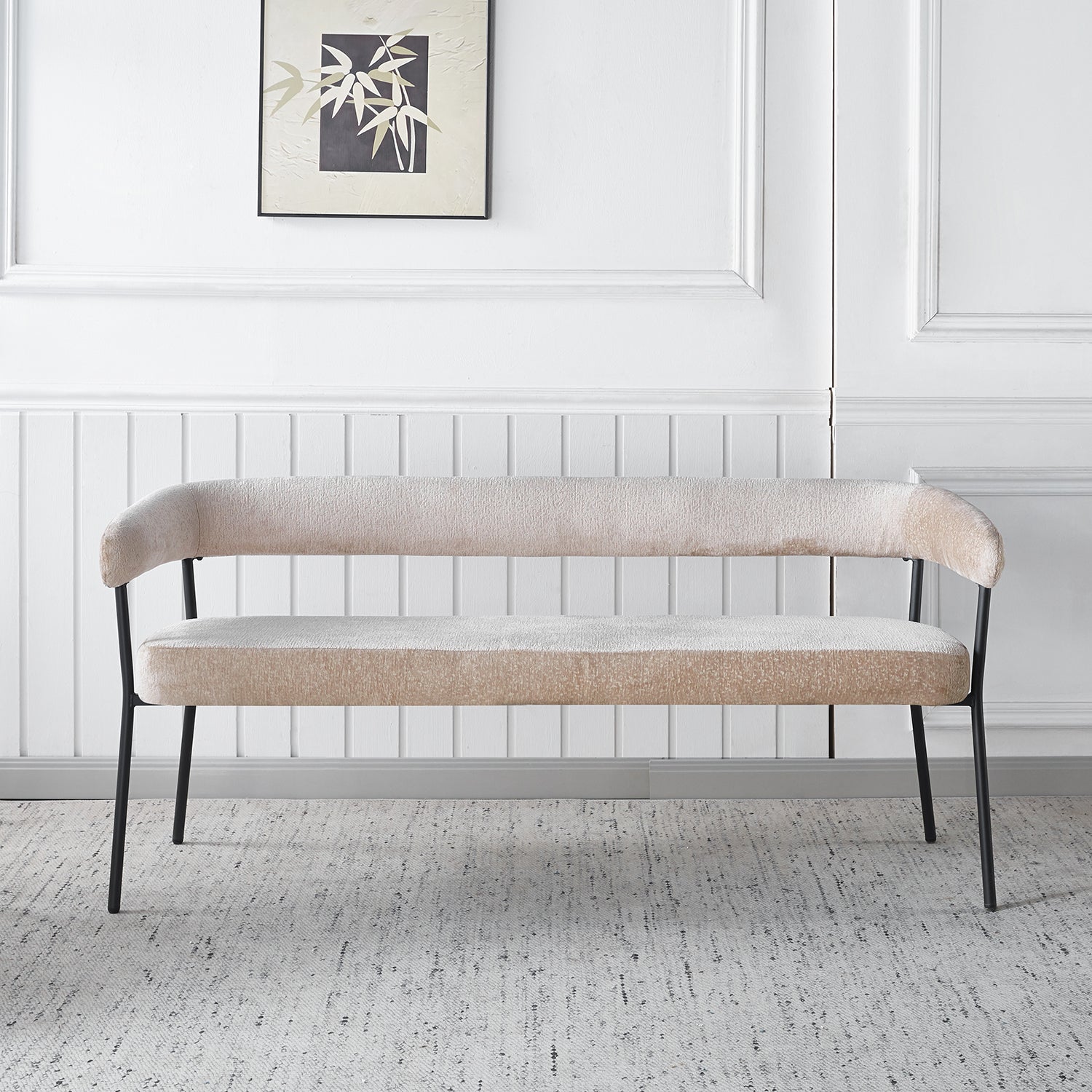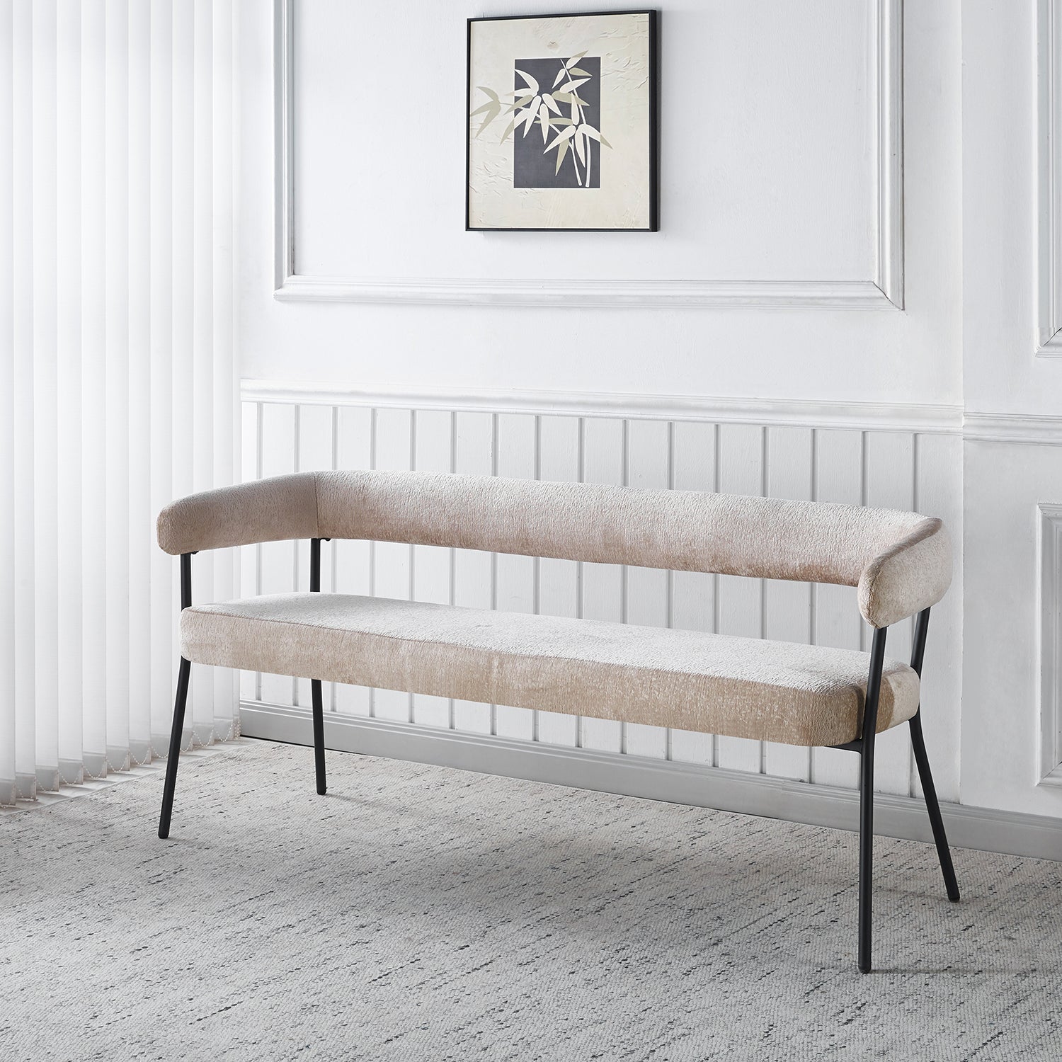 Maak jouw eethoek compleet met deze stijlvolle eetkamerbank. De combinatie van een zachte stoffen bekleding en het zwarte metalen frame zorgt voor een tijdloze, moderne uitstraling. Dankzij de comfortabele rugleuning en armleuningen is deze zitbank perfect voor lange diners of gezellige momenten aan tafel.