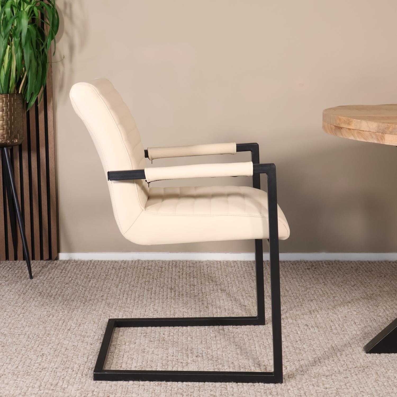 Deze stoere eetkamerstoel met armleuningen combineert robuuste looks met praktisch comfort. De zachte eco-lederen zitting en het matzwarte metalen frame geven de stoel een moderne, industriële uitstraling die moeiteloos aansluit bij diverse interieurstijlen. Perfect om lange avonden aan tafel te zitten - van diner tot borrelmoment.