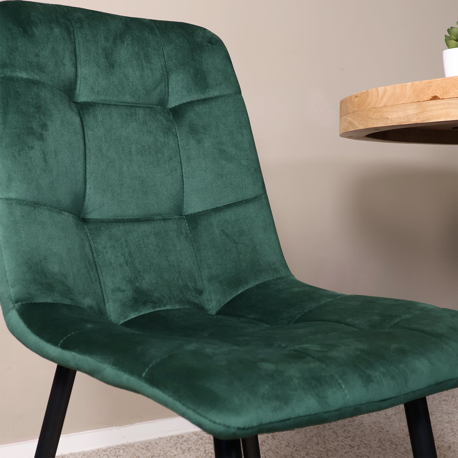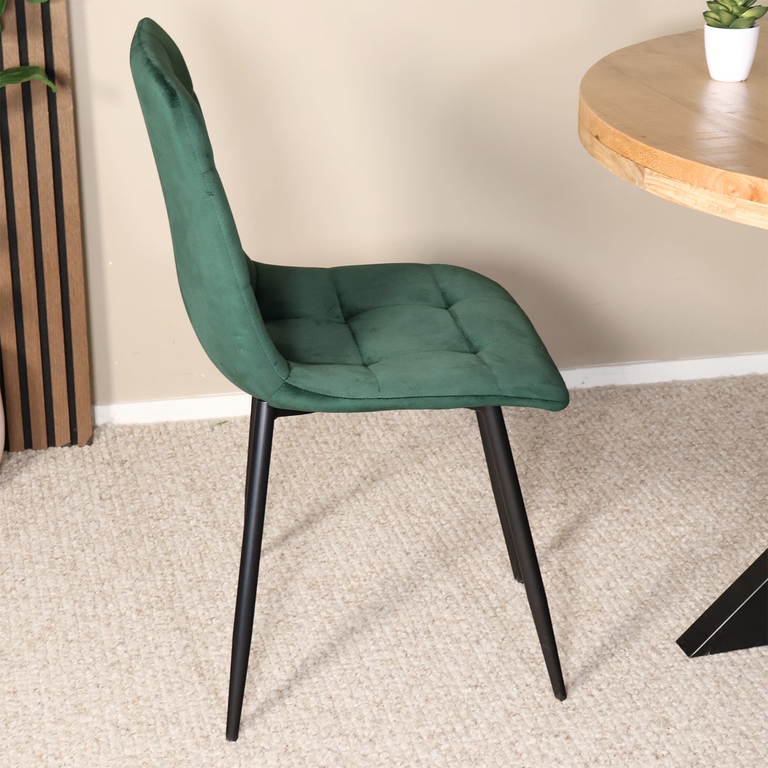 Deze velvet eetkamerstoel voegt een vleugje luxe toe aan jouw interieur. De fluweelzachte zitting met elegant blokpatroon zorgt voor een warme, chique uitstraling, terwijl het zwarte metalen onderstel een modern contrast biedt. Perfect voor aan de eettafel, maar ook een stijlvolle aanvulling in je woonkamer, slaapkamer of werkhoek.