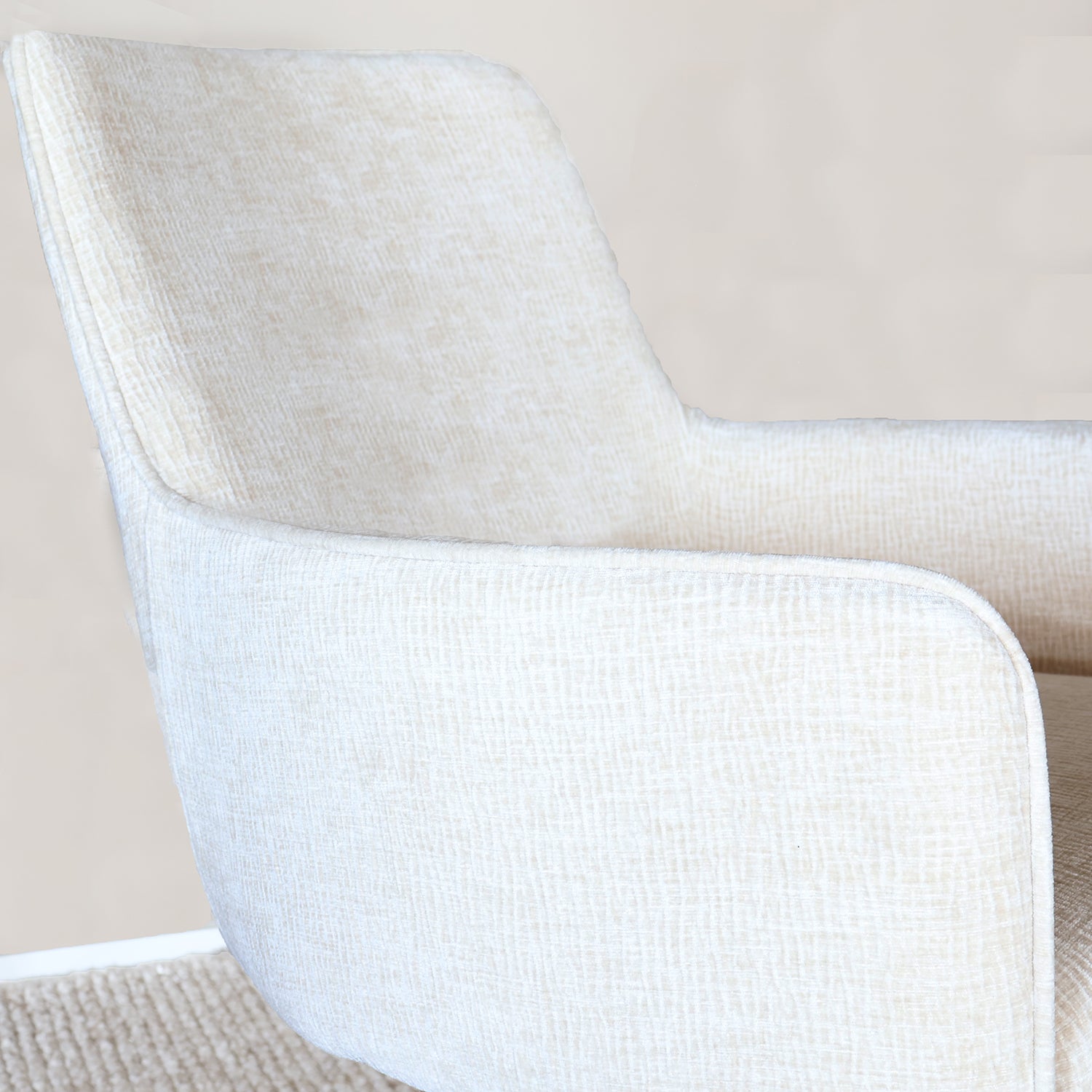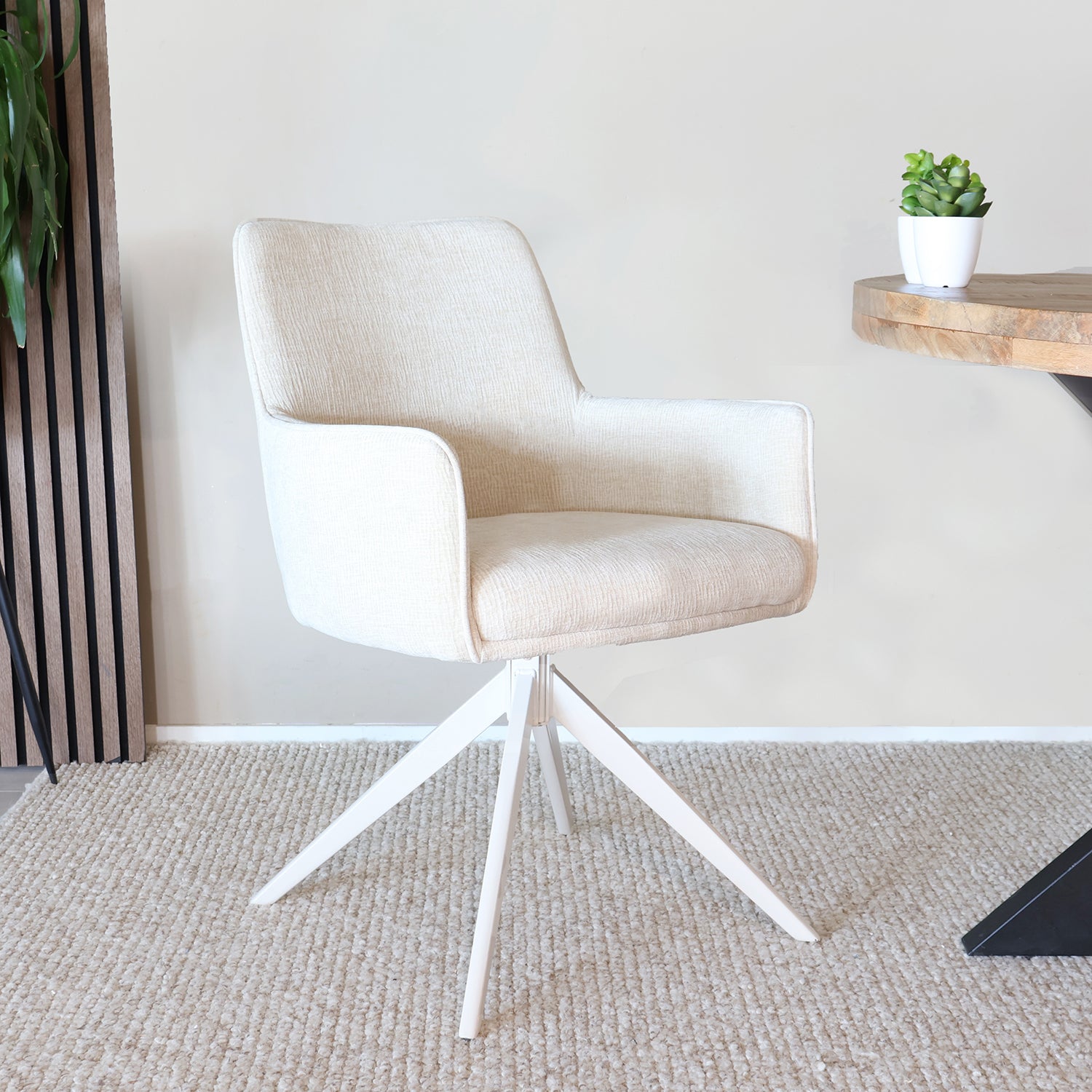 Deze draaibare eetkamerstoel combineert elegantie met praktisch comfort. Dankzij het 180° draaimechanisme met automatische ‘back to place’-functie schuif je moeiteloos aan tafel zonder de stoel te verplaatsen. De zachte chenille bekleding voelt heerlijk aan en geeft de stoel een luxueuze uitstraling, terwijl het metalen onderstel zorgt voor een moderne, industriële look.
