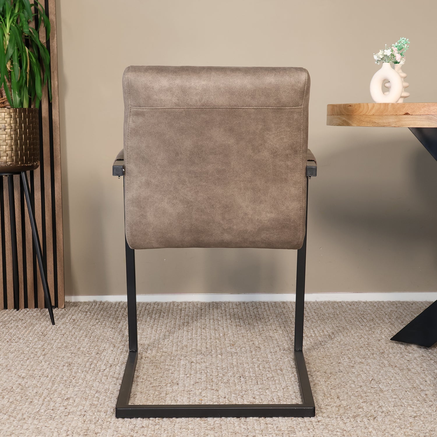 Deze moderne eetkamerstoel met armleuningen brengt comfort en elegantie samen aan tafel. De zachte stoffen bekleding voelt warm en luxe aan, terwijl het zwarte metalen frame zorgt voor een stoer contrast. Ideaal voor lange etentjes of gezellige borrelavonden, en moeiteloos te combineren met verschillende woonstijlen.