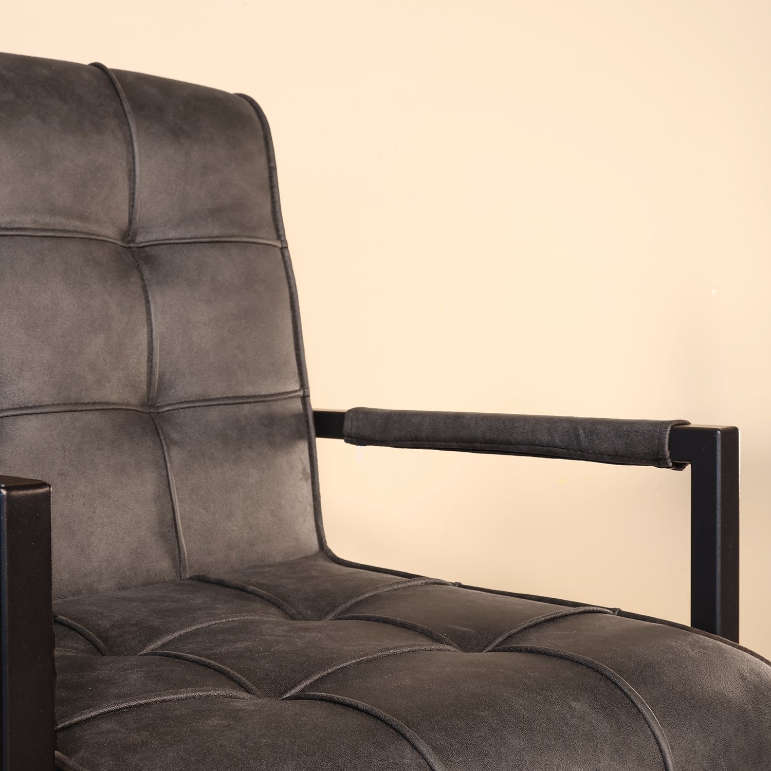 Het robuuste frame van de stoel is vervaardigd uit zwart gepoedercoat staal, wat zorgt voor een moderne, industriële uitstraling. De kunststof vloerdoppen onder het frame beschermen je vloer, maar afhankelijk van het type vloer adviseren we het toevoegen van viltjes om krassen of schade te voorkomen.