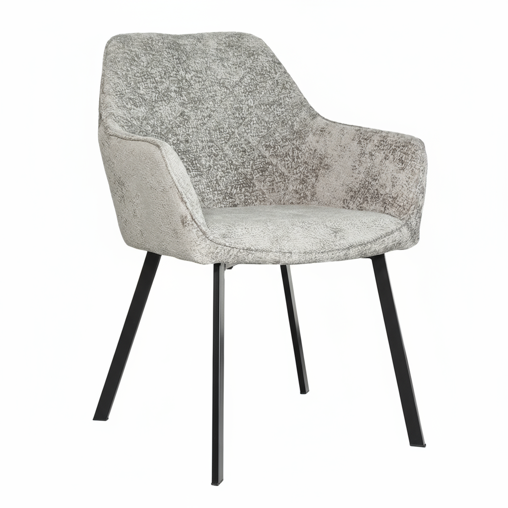 Deze stoffen eetkamerstoel combineert elegantie en comfort op een verfijnde manier. De zachte chenille bekleding met subtiele glans voelt luxe aan, terwijl het metalen onderstel zorgt voor een moderne, luchtige uitstraling. Ideaal voor gezellige avonden tafelen of als stijlvolle eyecatcher in je woonkamer.
