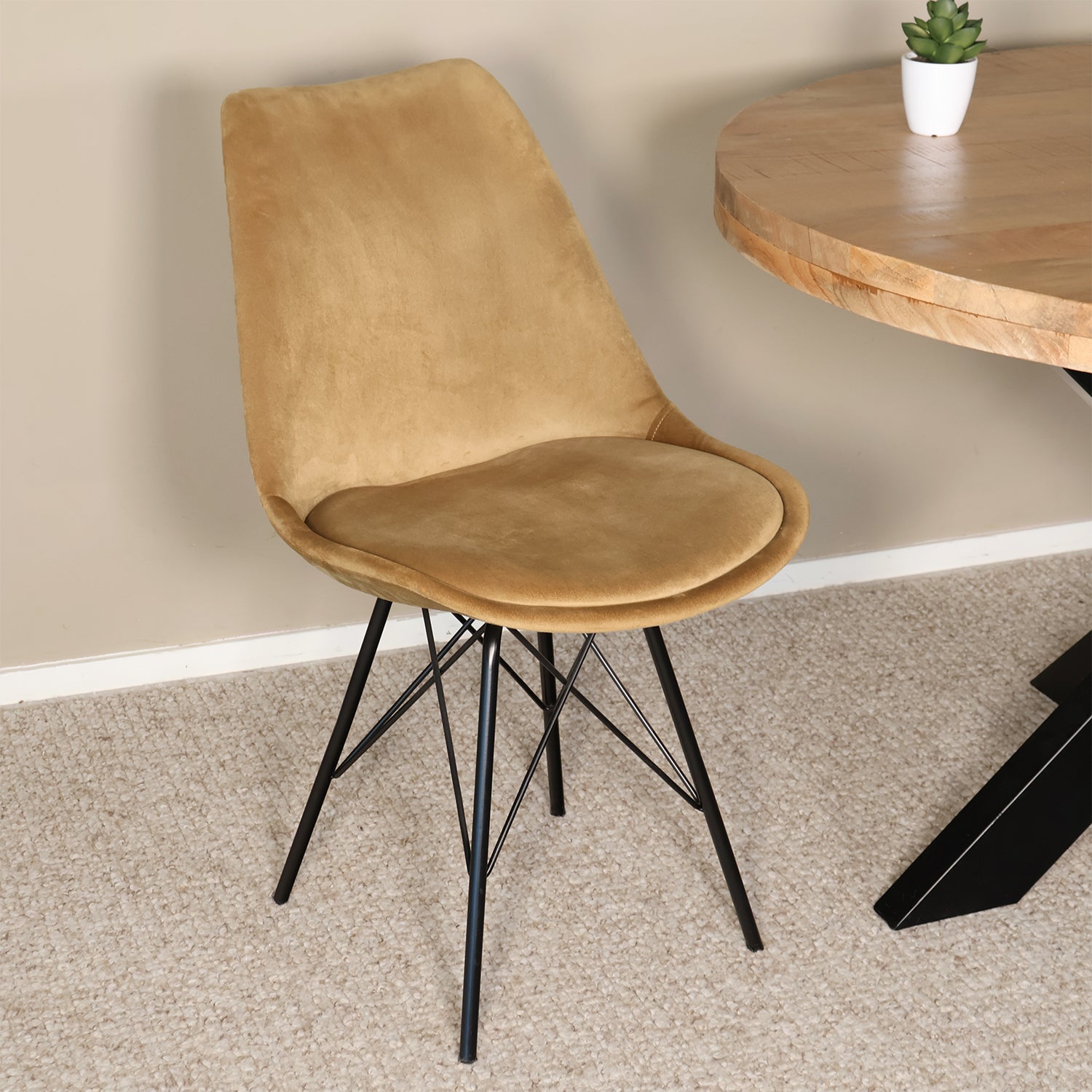 Voeg een vleugje luxe toe aan je interieur met deze stijlvolle velvet eetkamerstoel. De zachte fluwelen bekleding straalt elegantie uit, terwijl het zwarte metalen onderstel een stoer accent toevoegt. Dankzij het tijdloze design past deze comfortabele stoel moeiteloos in zowel Scandinavische, moderne als industriële eetkamers.