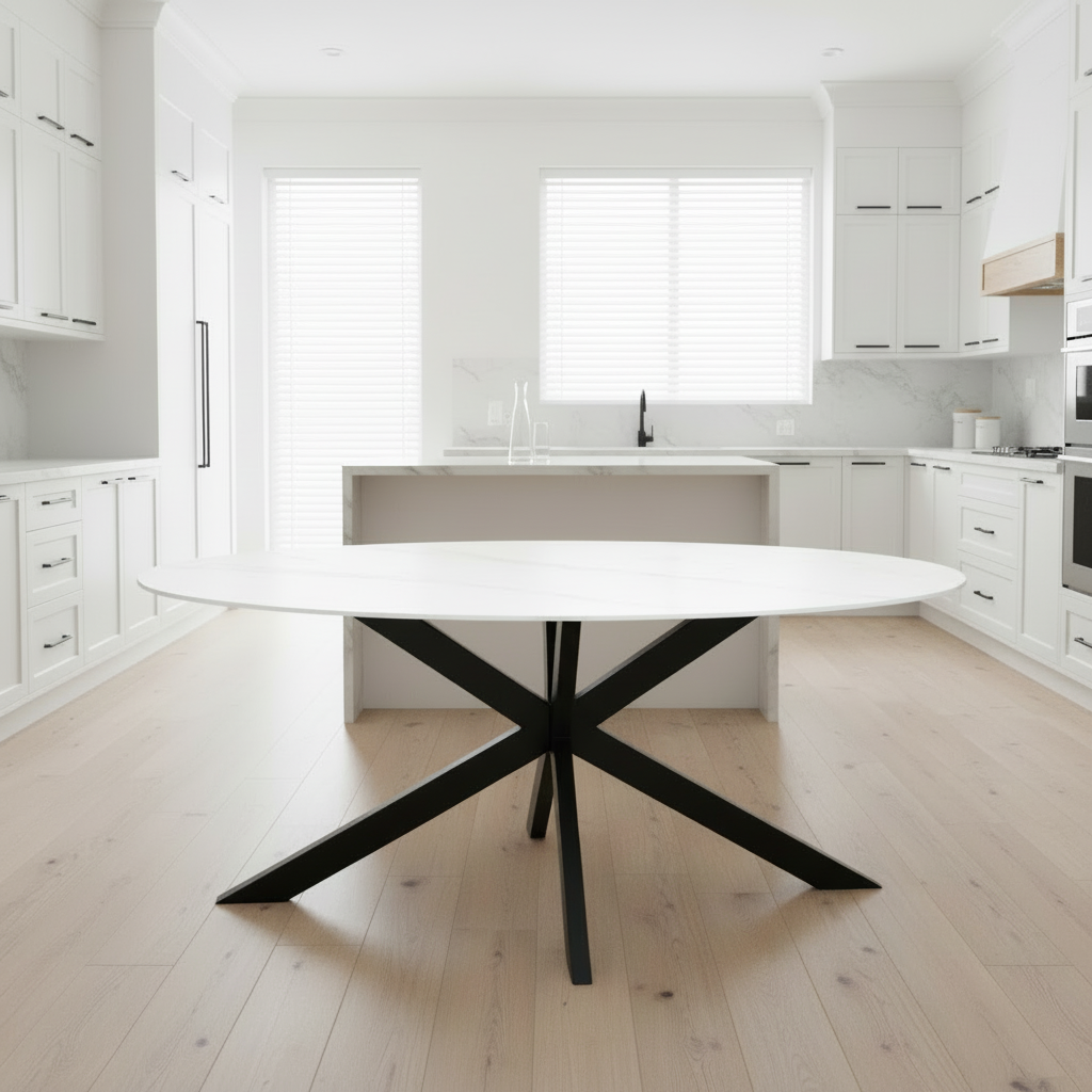 Met zijn verfijnde marmerlook en moderne uitstraling is deze ovale eettafel een stijlvolle toevoeging aan elk interieur. Het duurzame blad van sintered stone combineert luxe design met uitzonderlijke stevigheid, terwijl het metalen onderstel zorgt voor een stoer industrieel karakter. Ideaal voor een knusse maaltijd met het gezin of een sfeervolle avond met vrienden.