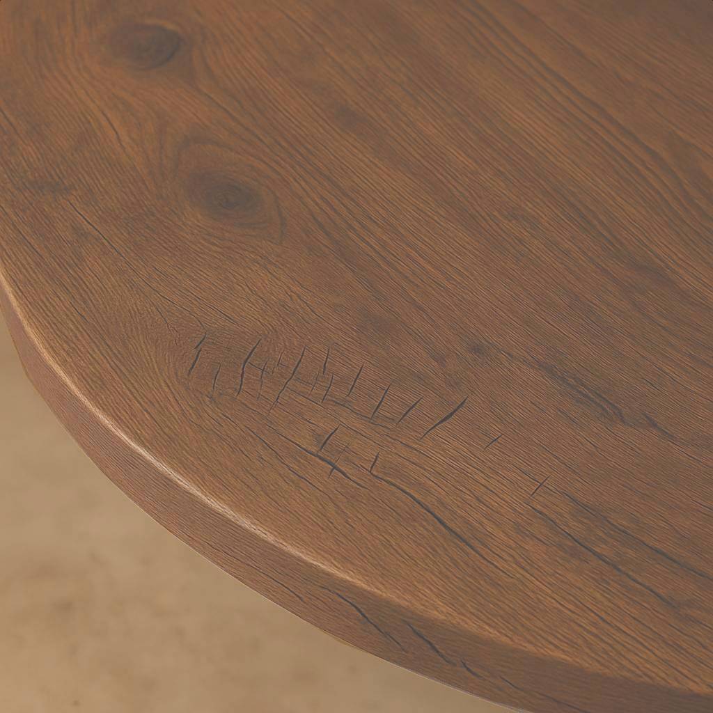 Deze eettafel is gemaakt van MDF met een realistische houtlook print. Dit geeft de tafel een luxe uitstraling, maar maakt het oppervlak gevoelig voor agressieve schoonmaakmiddelen en kleefmaterialen zoals plakband.