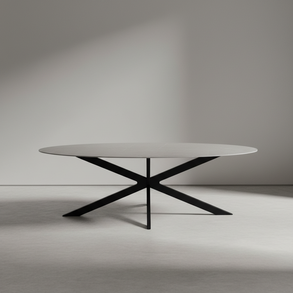 Met zijn elegante ovale vorm en luxueuze marmerlook is deze eettafel een stijlvolle blikvanger in elke eetkamer. Het sintered stone blad straalt verfijning uit en is tegelijkertijd ijzersterk en onderhoudsvriendelijk. Dankzij het robuuste metalen onderstel krijgt het geheel een moderne, industriële touch – perfect voor zowel een strak als een warm interieur.