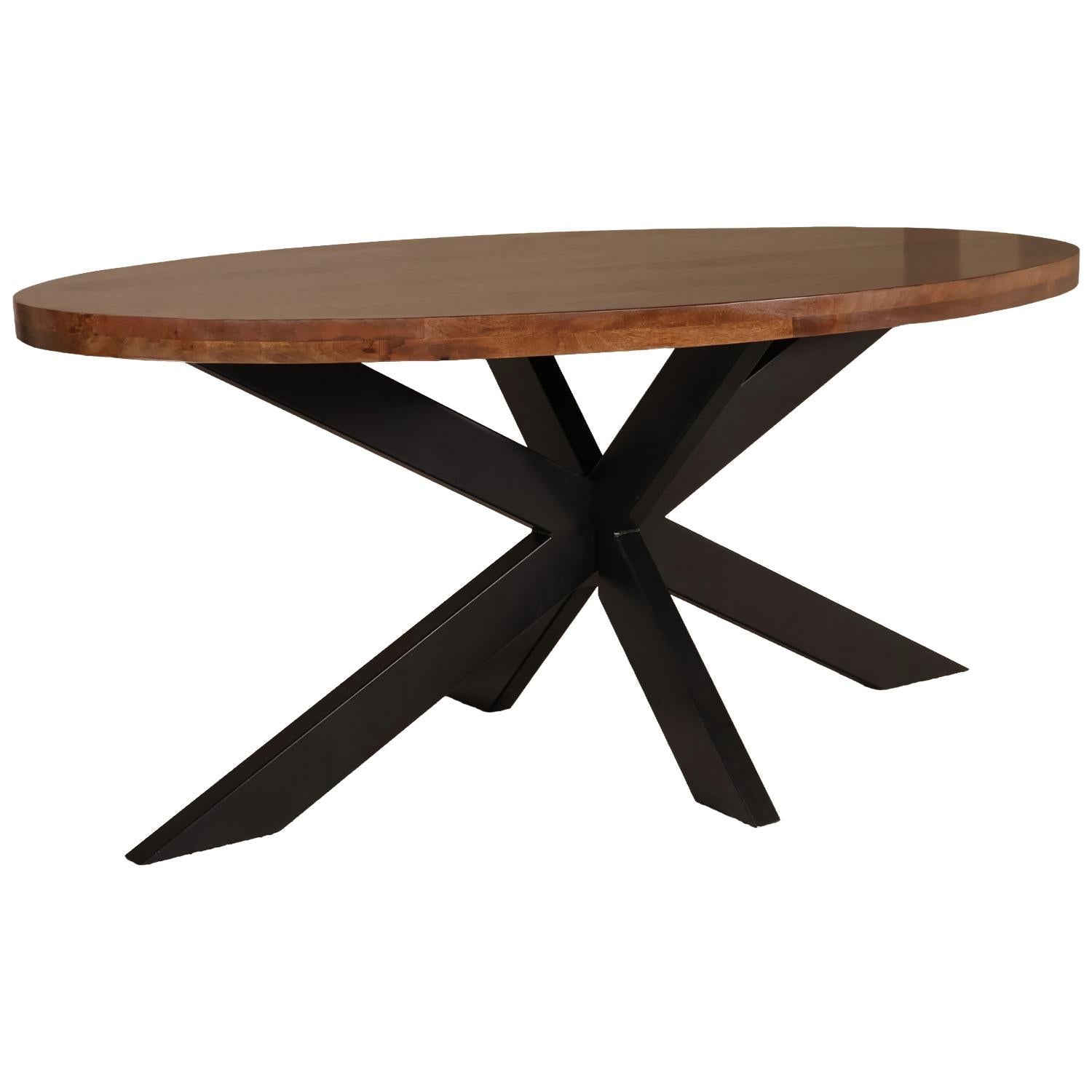 Deze ovale eettafel combineert natuurlijke warmte met een stoer industrieel design. Het mangohouten blad en het robuuste metalen onderstel zorgen samen voor een stijlvolle blikvanger die elke eetruimte karakter geeft. Dankzij de ovale vorm creëer je een gezellige, toegankelijke sfeer waarin iedereen makkelijk aanschuift.