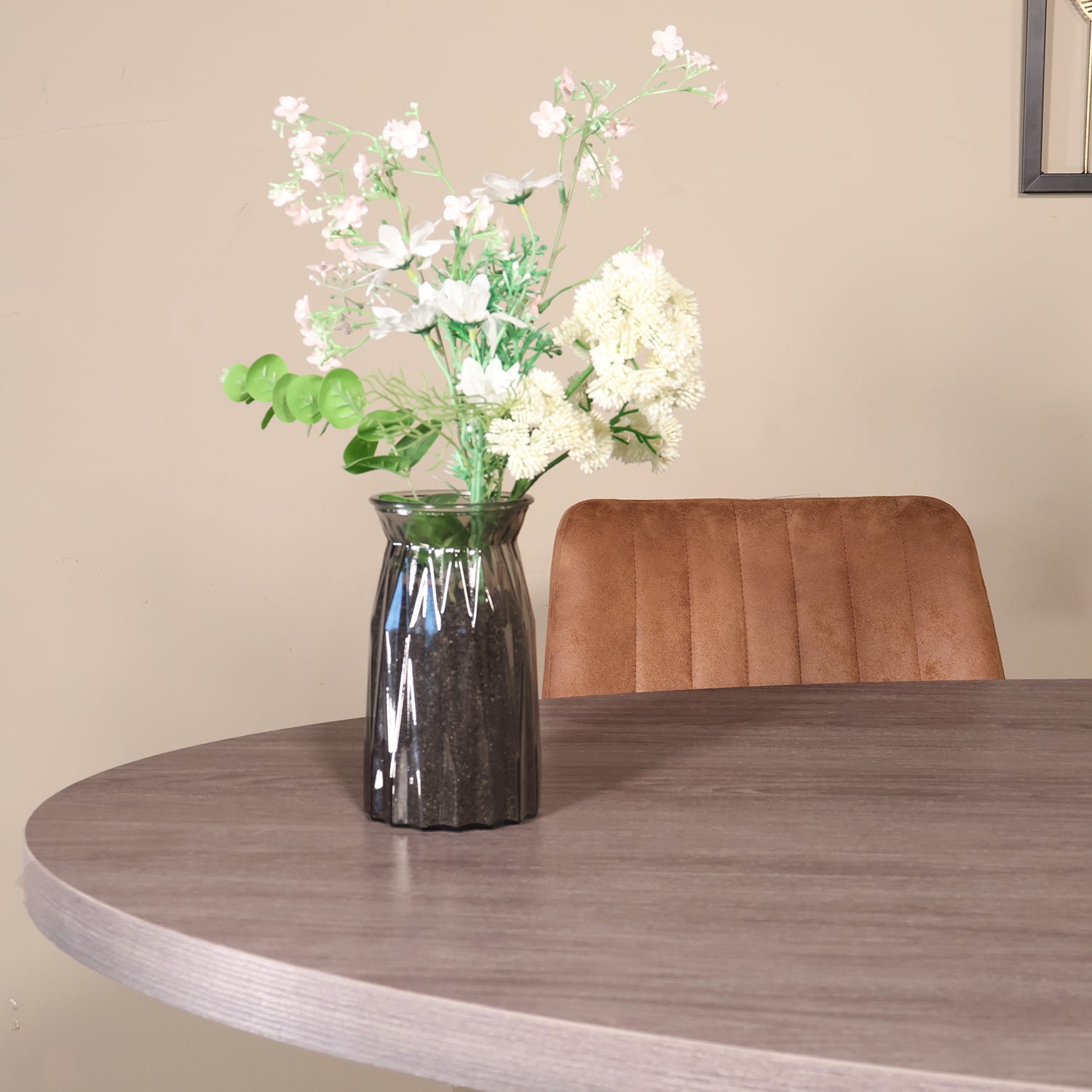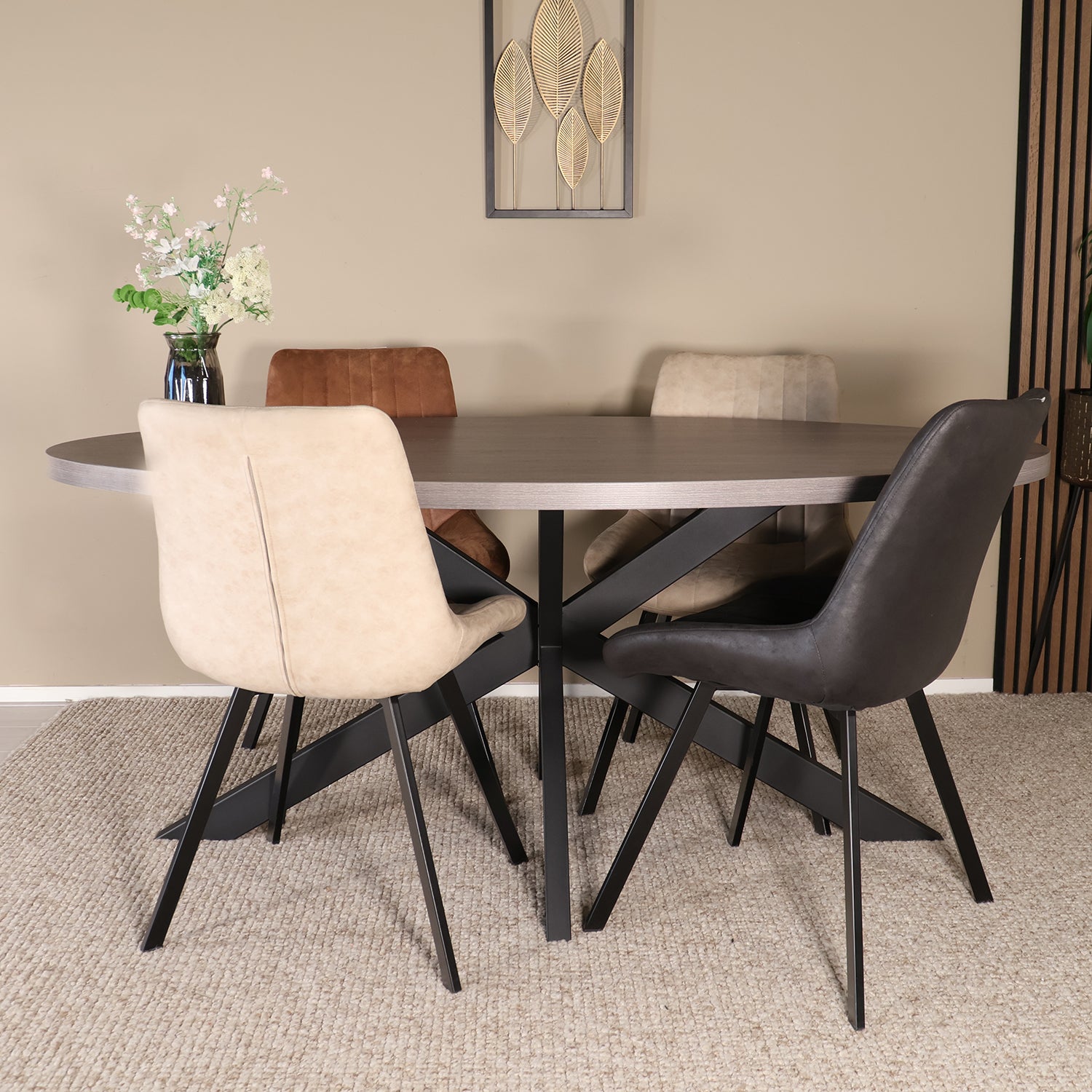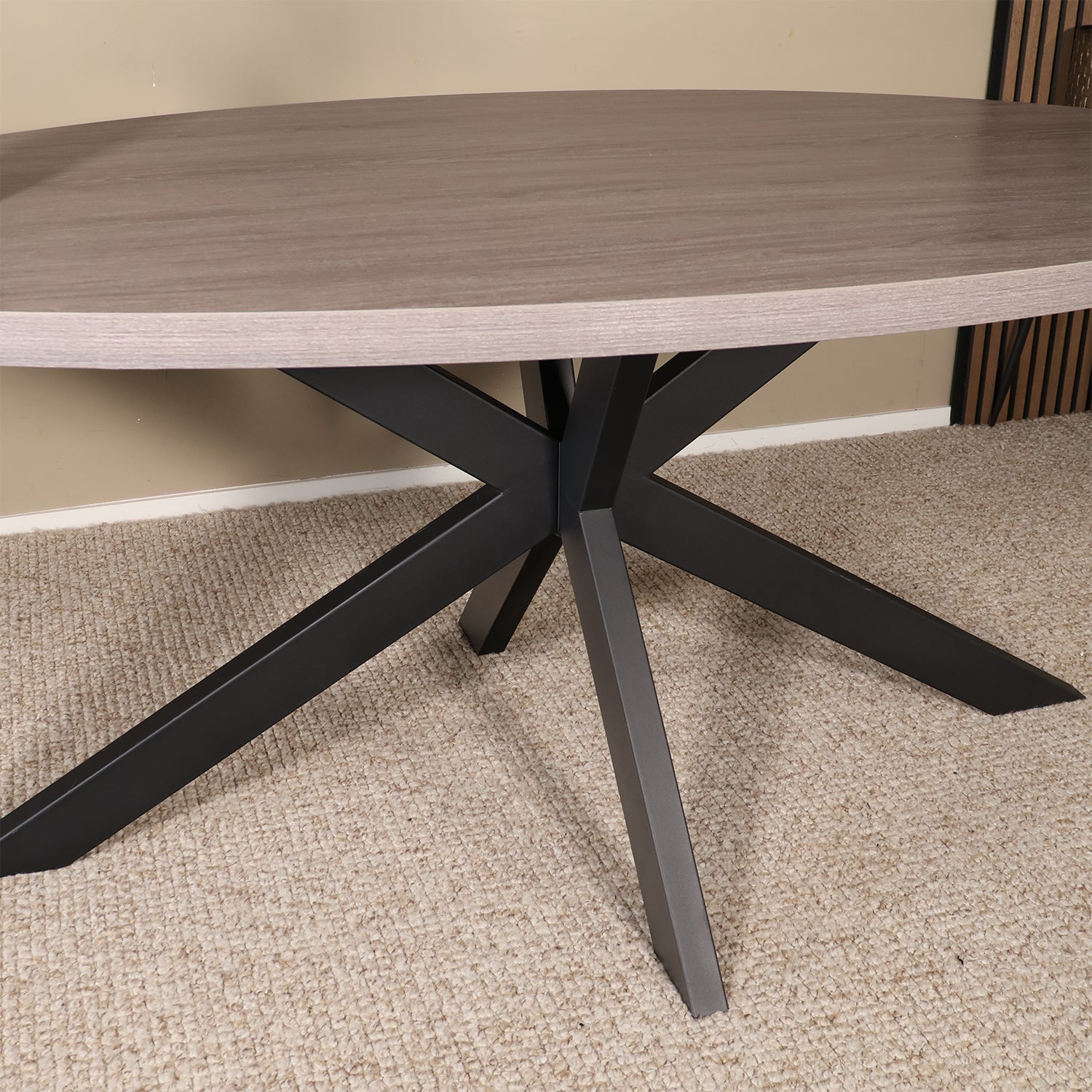 Met zijn moderne ovale vorm en industriële metalen onderstel brengt deze eettafel karakter in elke eetruimte. Het realistische houtdessin geeft warmte aan het interieur, terwijl het onderhoudsvriendelijke melamine blad zorgt voor praktisch gebruiksgemak. Ideaal voor wie houdt van een stoere, eigentijdse stijl met een vleugje comfort.