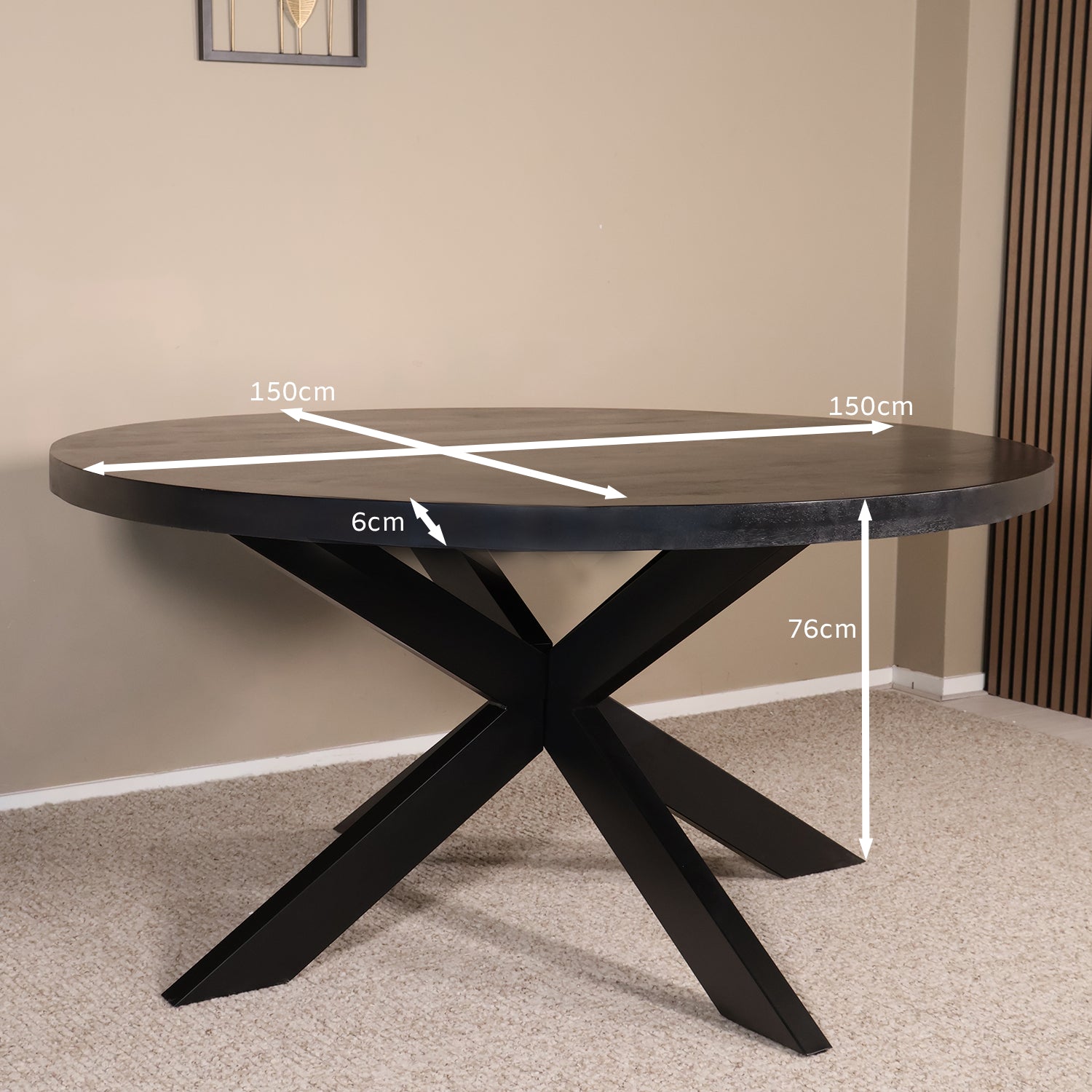 - Eettafel van Ø 150 × H 76 cm met een blad van 6 cm dik