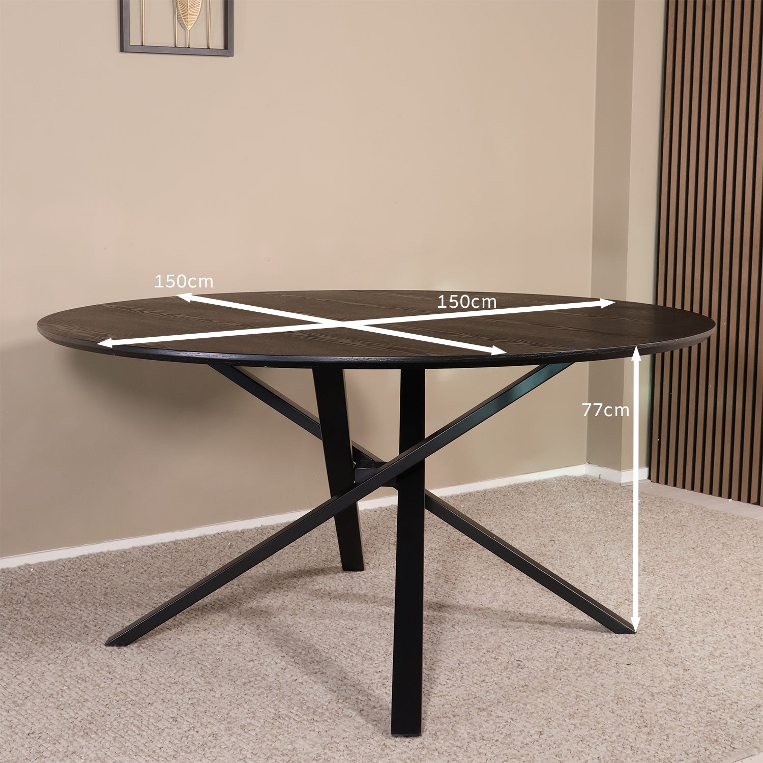 - Ronde eettafel van Ø150 × H 76 cm met een stevig blad van 1,8 cm dik