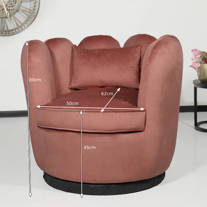 Ervaar ultiem comfort met deze elegante draaifauteuil. De zachte velvet bekleding voelt heerlijk luxe aan en de rugleuning met subtiele bloembladvorm geeft de stoel een unieke, stijlvolle uitstraling. Dankzij het stevige metalen onderstel en het ruime zitvlak is deze fauteuil ideaal voor een ontspannen moment in de woonkamer of slaapkamer.