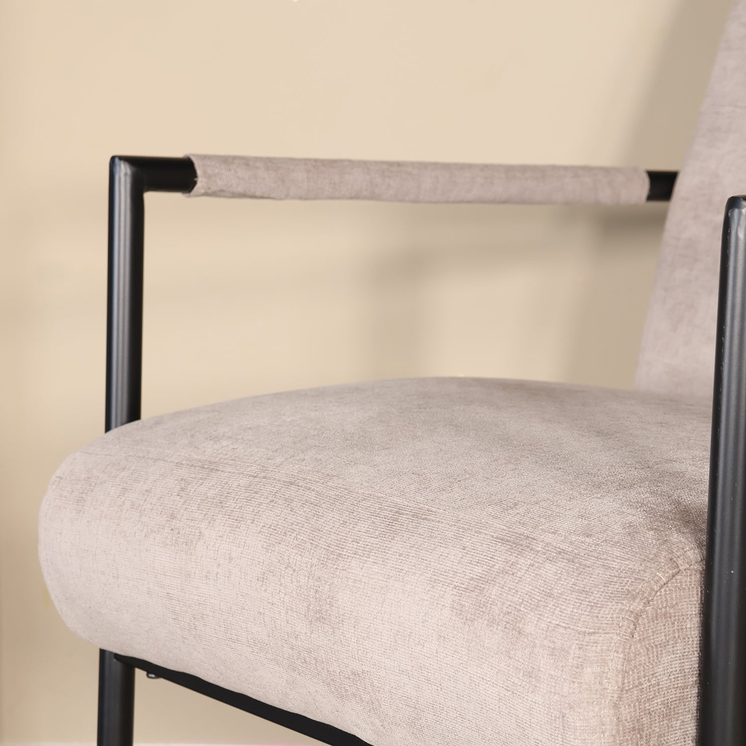 Deze stijlvolle fauteuil met zachte chenille bekleding combineert modern design met optimaal comfort. De warme kleur en het metalen frame geven de stoel een stoere, maar tijdloze uitstraling die in elk interieur past. Perfect voor in de woonkamer, leeshoek of lounge – een comfortabele blikvanger voor elk moment van ontspanning.