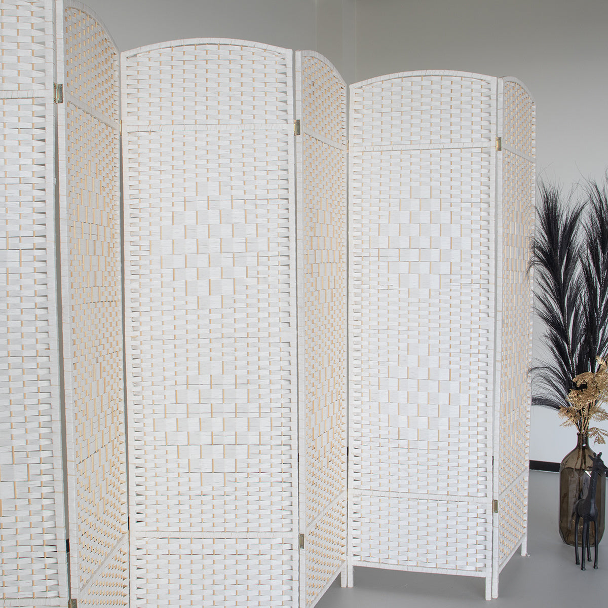 Dit kamerscherm heeft rieten vlechtwerk en houten latjes waarop het kamerscherm steunt! Het kamerscherm is ook perfect om zakelijk te gebruiken. Zet deze bijvoorbeeld in je massage- of beauty salon wanneer je niet veel mogelijkheden hebt maar je klanten toch enige privacy wilt bieden!