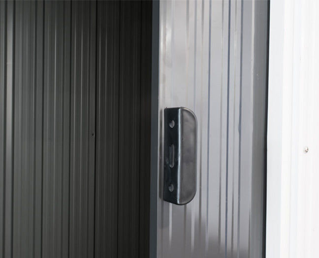 Dit metalen tuinhuis wordt geleverd inclusief drempelplaat en ventilatieroosters. Dankzij de schuin aflopende rand in het tuinhuisje is een fundering niet per se nodig, je kunt namelijk gemakkelijk een vloer creëren door planken, platen of tegels op deze rand te leggen. Vul het tuinhuisje aan met een opbergrekje of verlichting en sluit het schuurtje af met een hangslot!