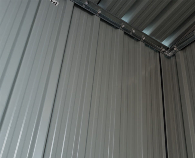 Dit metalen tuinhuis kun je prima als schuur of opbergruimte gebruiken, dit tuinhuisje is namelijk volledig roestvrij! De platen zijn bij levering voorzien van een plastic beschermlaag welke je dient te verwijderen om te voorkomen dat er vocht onder komt en hierdoor corrosie ontstaat. Na het monteren van het tuinhuisje hoef je deze alleen nog maar te verzwaren en/of te verankeren. Dit kun je doen doormiddel van platen, planken of tegels op de schuin aflopende rand of door het schuurtje aan de grond vast te schroeven of in te graven in de tuin.