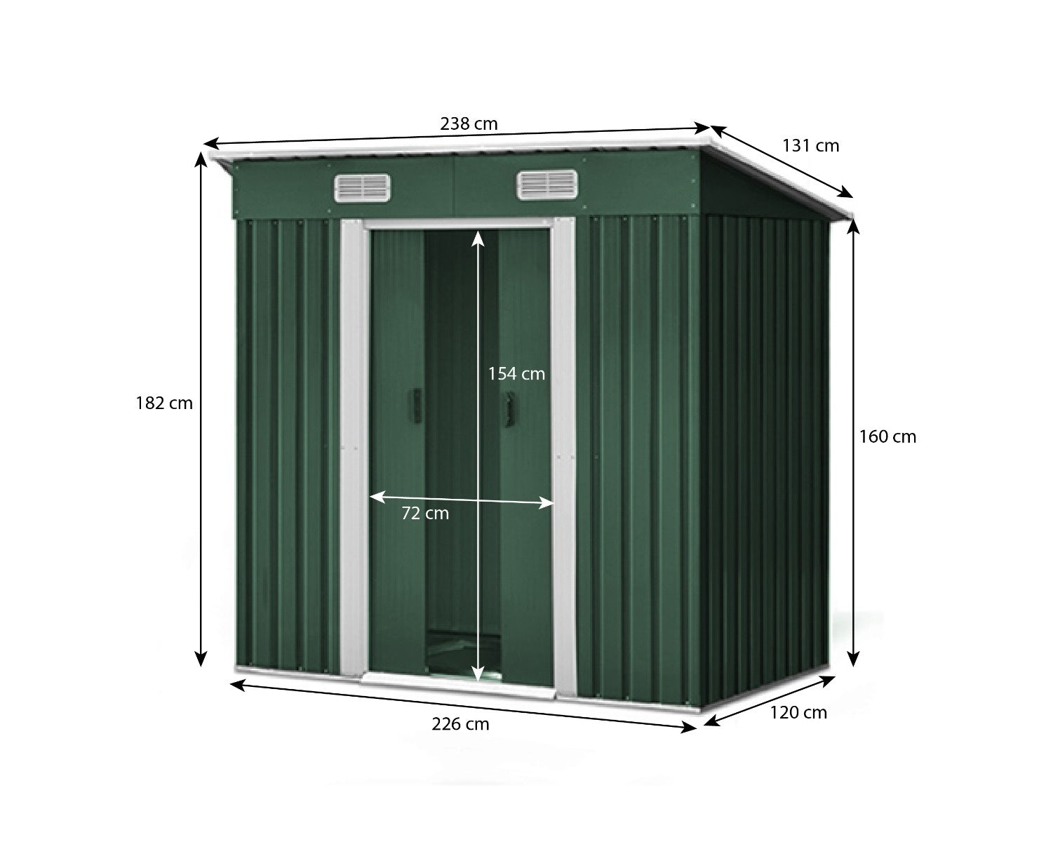 - Kleur: groen met witte ventilatieroosters en deurlijsten