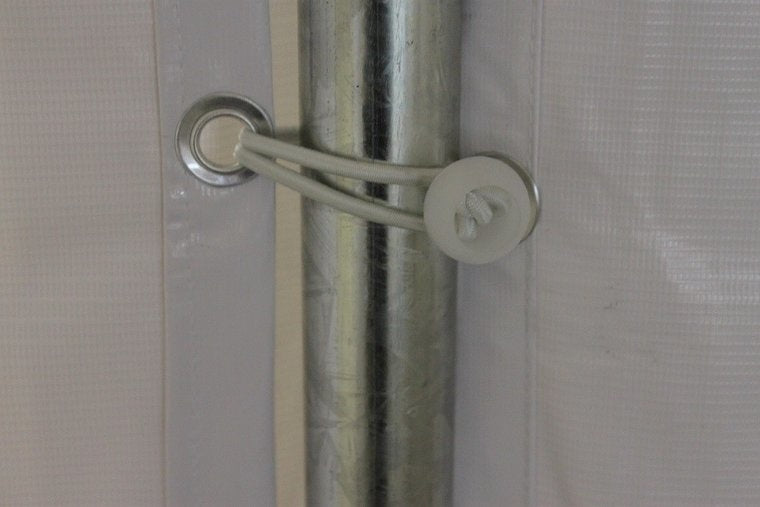 Het zeil van de partytent is 100% waterdicht, dik brandvertragend vrachtwagenzeil. De zijwanden zijn gemaakt van PVC en bestaan uit één deurwand met ritssluiting, één dichte wand en de lengte bestaat uit diverse wanden van 2m met raam. Deze worden door middel van elastieken ballen aan elkaar bevestigt en door middel van elastieken met ballen aan het dakzeil en op de hoekpunten aan de palen.