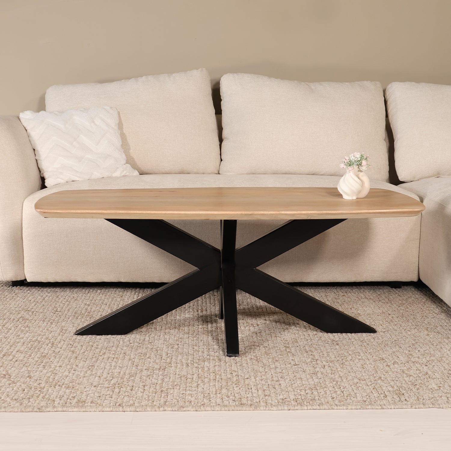 De salon tafel heeft een stevig blad van echt mangohout, geen standaard MDF, wat zorgt voor duurzame kwaliteit. Het zwarte, gepoedercoate metalen frame voegt een robuuste uitstraling toe. Mangohout is een milieuvriendelijke keuze; het wordt pas geoogst als de boom niet langer mango’s produceert.