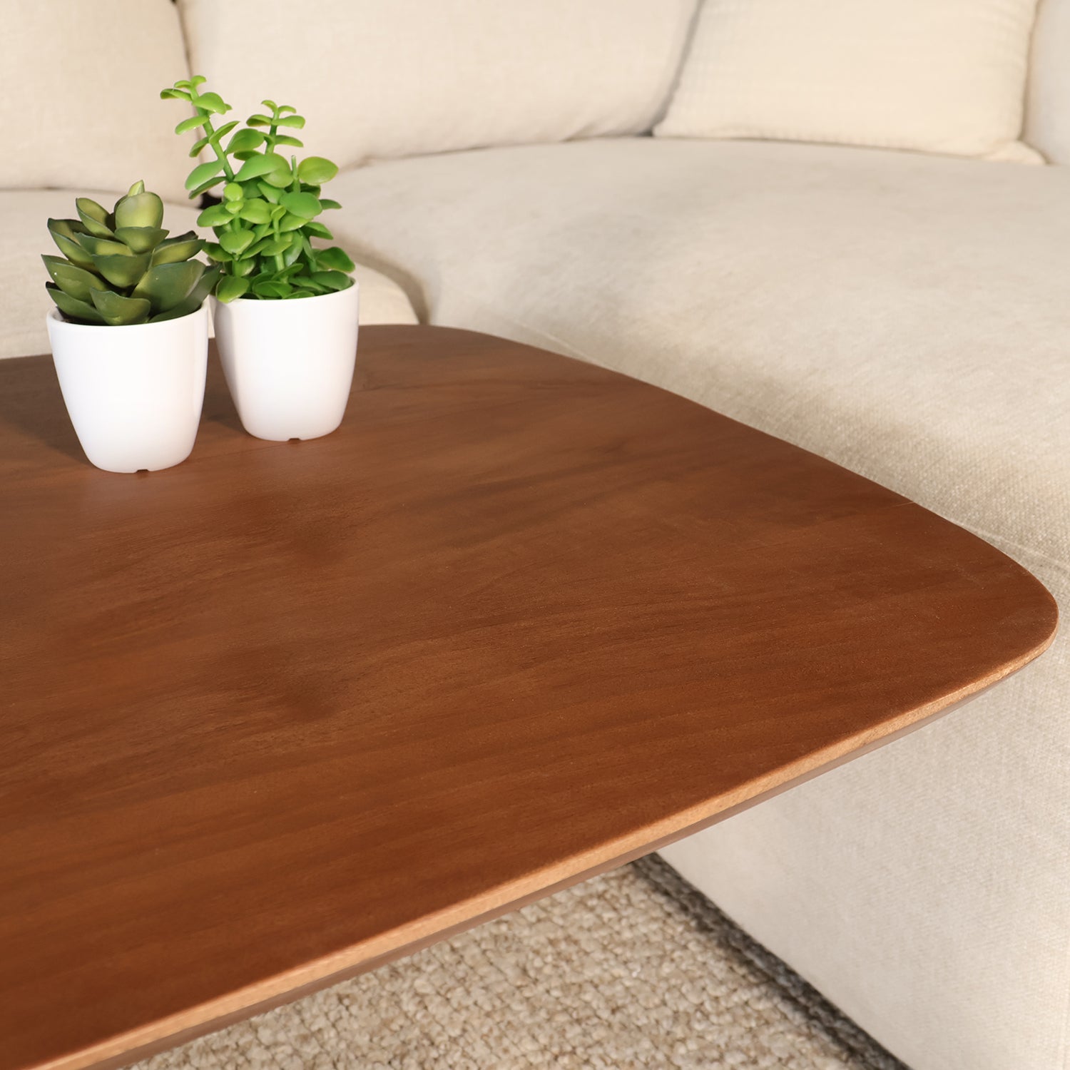 De salon tafel heeft een stevig blad van echt mangohout, geen standaard MDF, wat zorgt voor duurzame kwaliteit. Het zwarte, gepoedercoate metalen frame voegt een robuuste uitstraling toe. Mangohout is een milieuvriendelijke keuze; het wordt pas geoogst als de boom niet langer mango’s produceert.