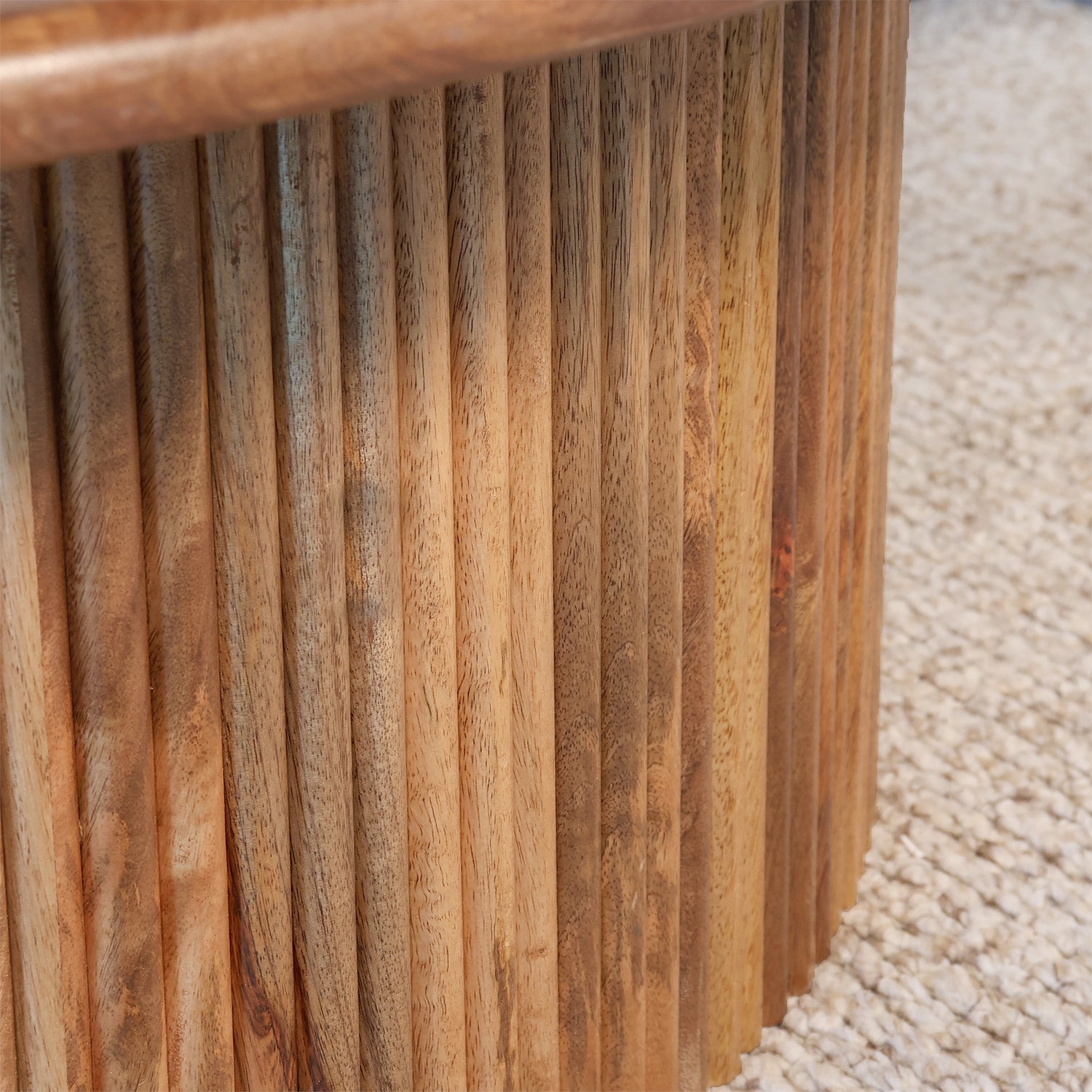 Deze ovale salontafel is een echt pronkstuk in jouw zithoek. De warme houtkleur, het afgeronde blad en het opvallende onderstel met verticale ribbelstructuur maken dit meubel tot een stijlvolle én praktische keuze. De combinatie van natuurlijke materialen en modern design zorgt voor een harmonieuze uitstraling in iedere woonkamer.