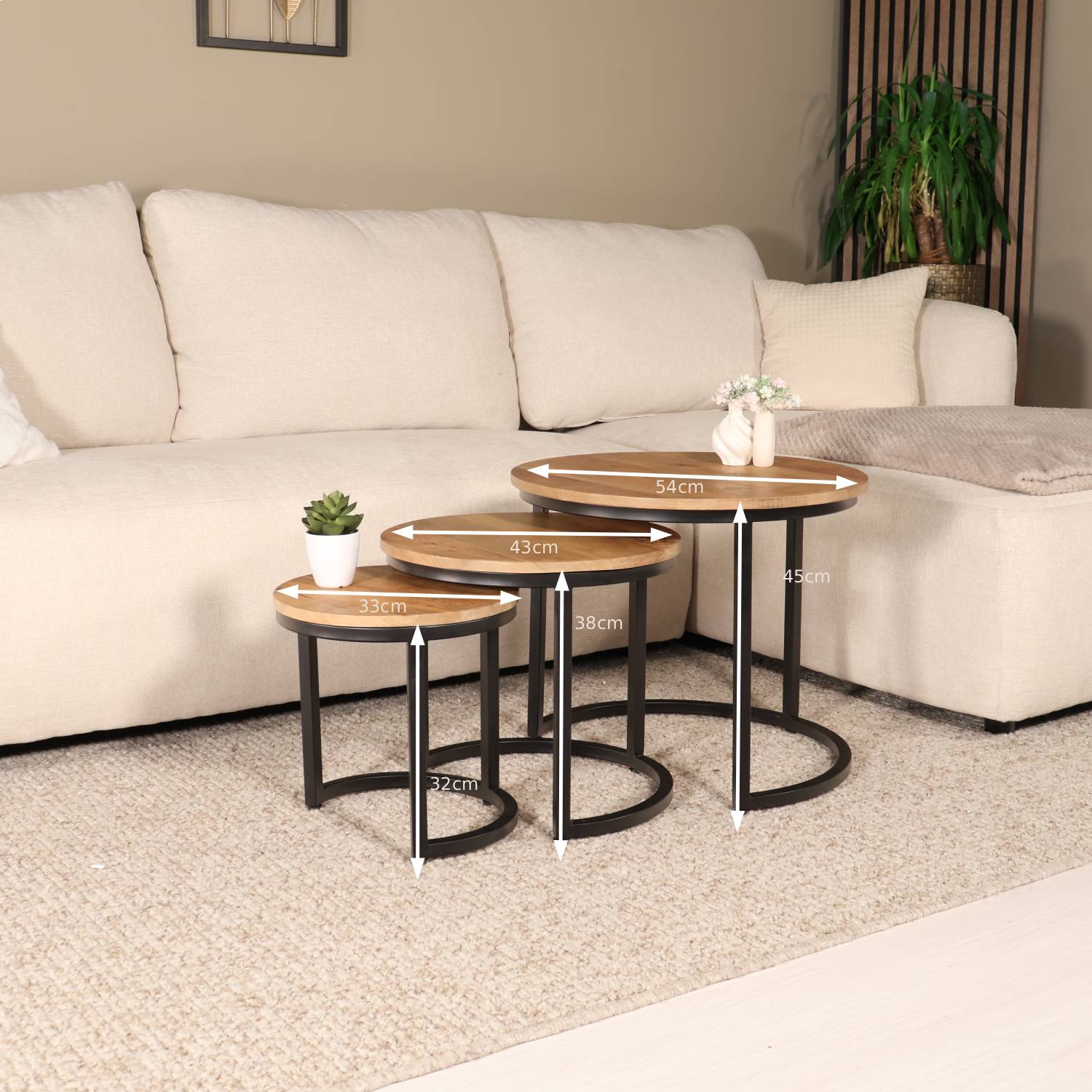 - Afmeting grootste tafel: Hoogte: 45,0cm Diameter Ø54,0cm