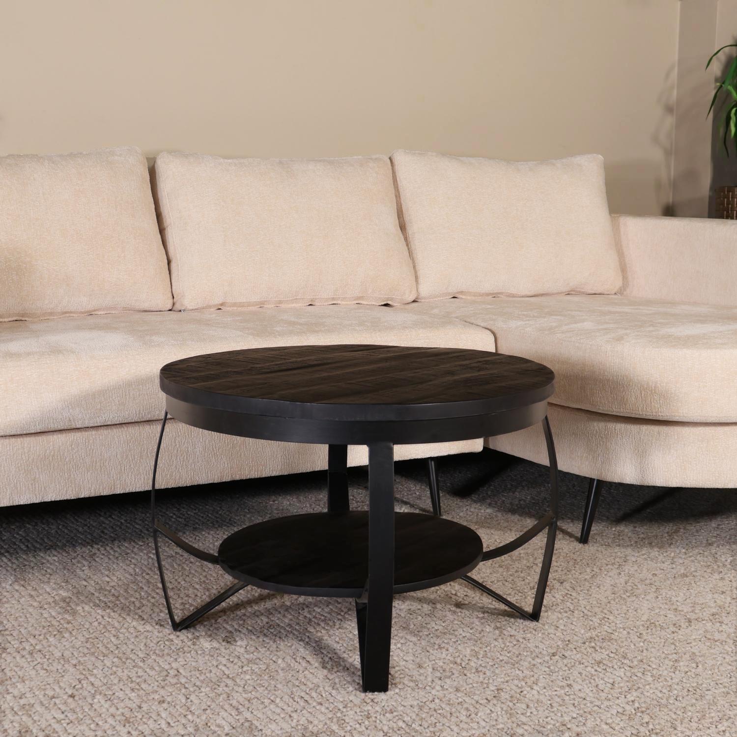 Deze stijlvolle ronde salontafel combineert elegantie met functionaliteit. Het robuuste mangohouten blad vormt een prachtig contrast met het metalen onderstel, wat zorgt voor een moderne en industriële uitstraling. Dankzij het extra plateau creëer je eenvoudig extra opbergruimte voor boeken, tijdschriften of decoratieve accessoires. Een veelzijdige tafel die niet alleen praktisch is, maar ook karakter toevoegt aan elke woonkamer of zithoek.