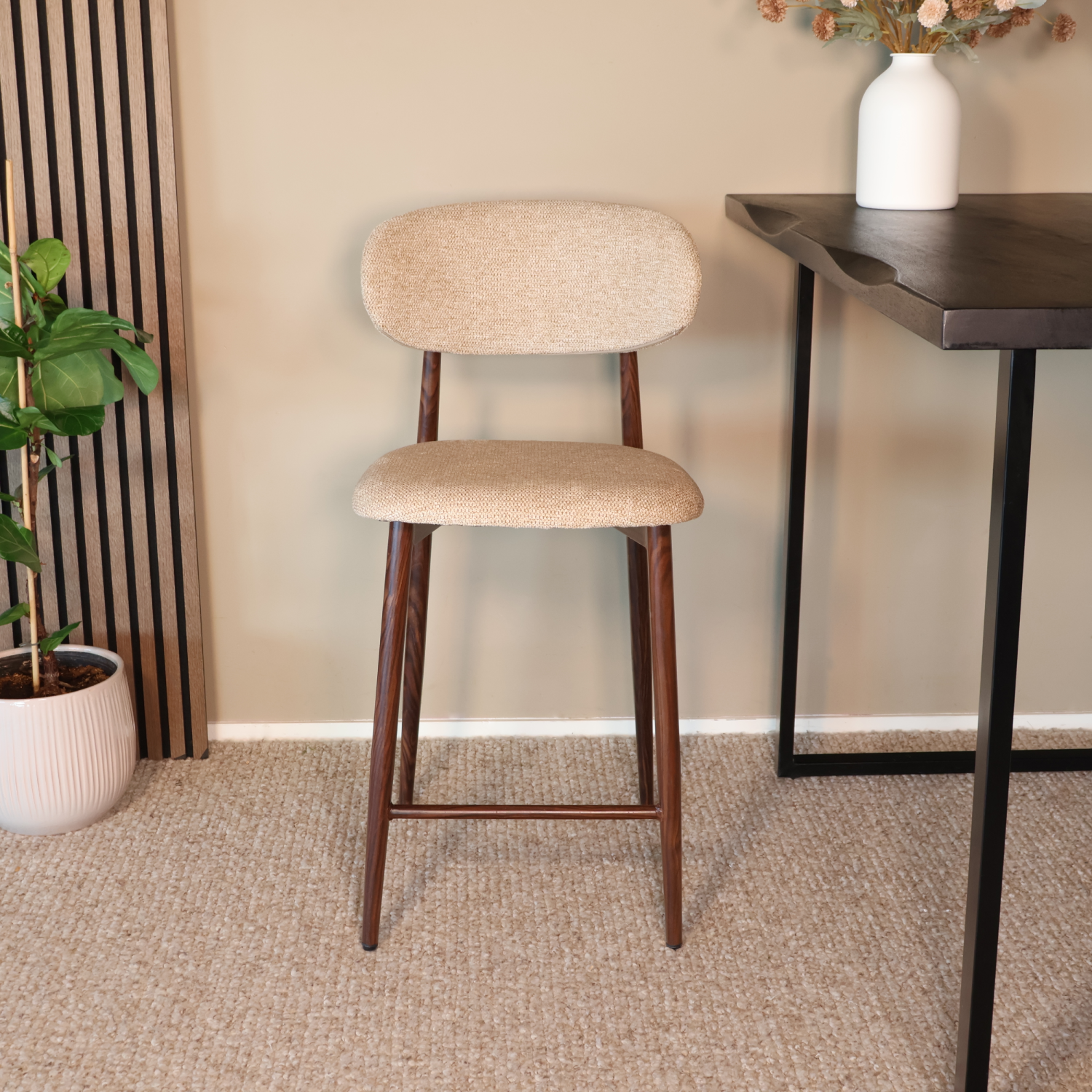 Breng rust, warmte en elegantie in huis met deze barkruk in verfijnde Japandi-stijl. De combinatie van een zachte stoffen zitting en een natuurlijk houtlook onderstel zorgt voor een harmonieuze balans tussen modern comfort en minimalistisch design. Perfect voor lange diners, rustige ochtenden aan de bartafel of als stijlvolle accentstoel in je keuken.