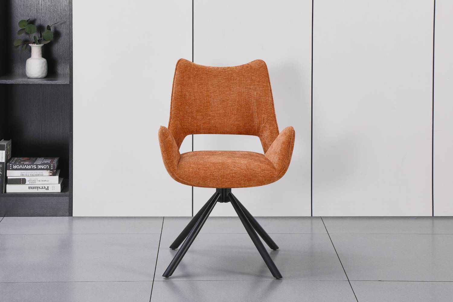 Ervaar ultiem zitcomfort met deze draaibare eetkamerstoel. De combinatie van zachte bekleding en een stevig metalen onderstel zorgt voor een harmonieuze balans tussen elegantie en functionaliteit. Dankzij het 180° draaimechanisme met ‘back to place’-functie beweegt de stoel soepel mee en keert hij automatisch terug op zijn plek – ideaal voor een opgeruimde uitstraling aan tafel.