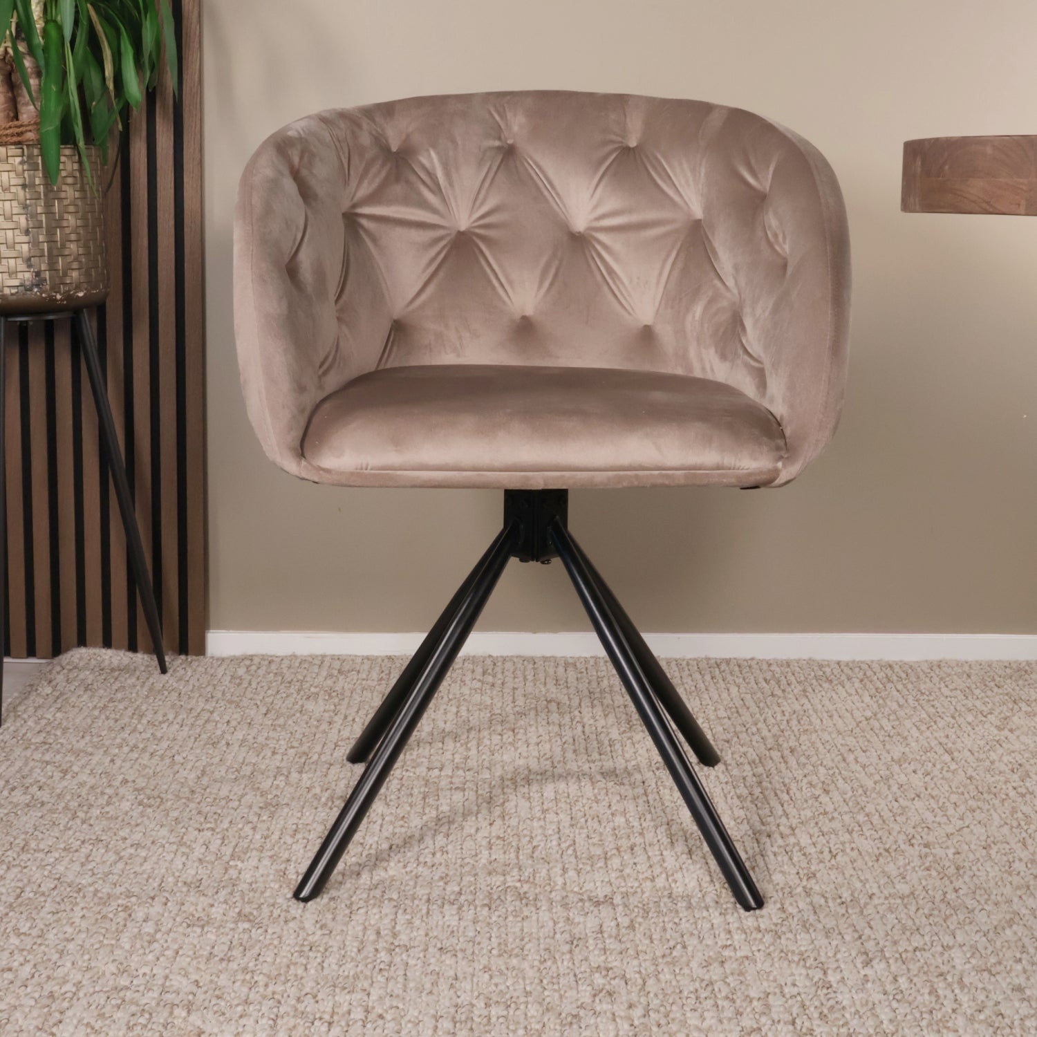 Deze draaibare eetkamerstoel brengt comfort en elegantie samen in één stijlvol ontwerp. De velvet bekleding geeft de stoel een chique uitstraling, terwijl het zwarte metalen onderstel zorgt voor een stoere industriële touch. Dankzij het 180° draaimechanisme met ‘back to place’-functie draait de stoel soepel terug naar zijn beginpositie — ideaal voor een opgeruimd geheel aan tafel.