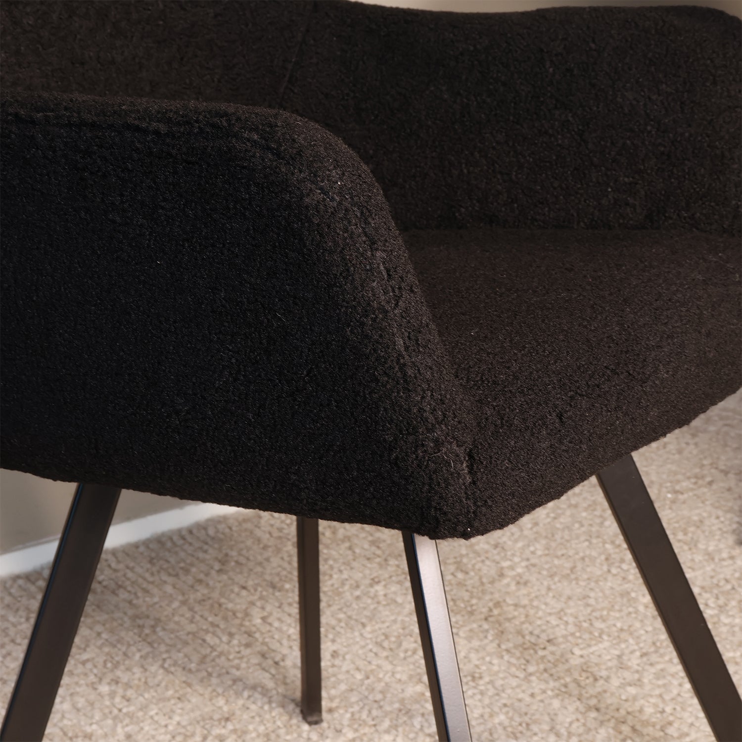 Deze moderne eetkamerstoel combineert een luxe uitstraling met optimaal zitcomfort. De zachte teddy bekleding voelt warm en uitnodigend aan, terwijl de open rugleuning en het metalen onderstel zorgen voor een luchtig en eigentijds karakter. Perfect voor wie comfort en design moeiteloos wil samenbrengen in de eetkamer of woonkamer.