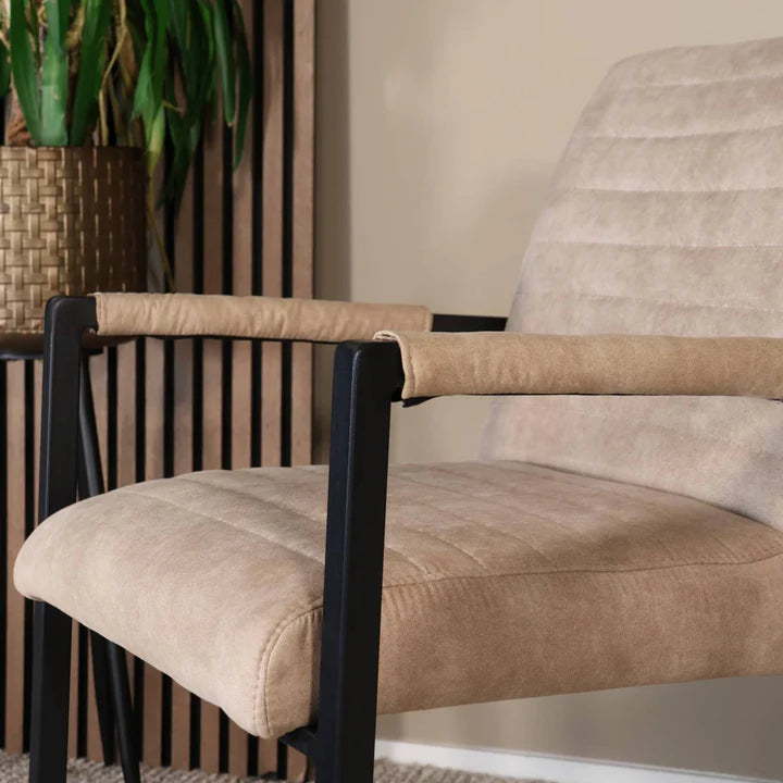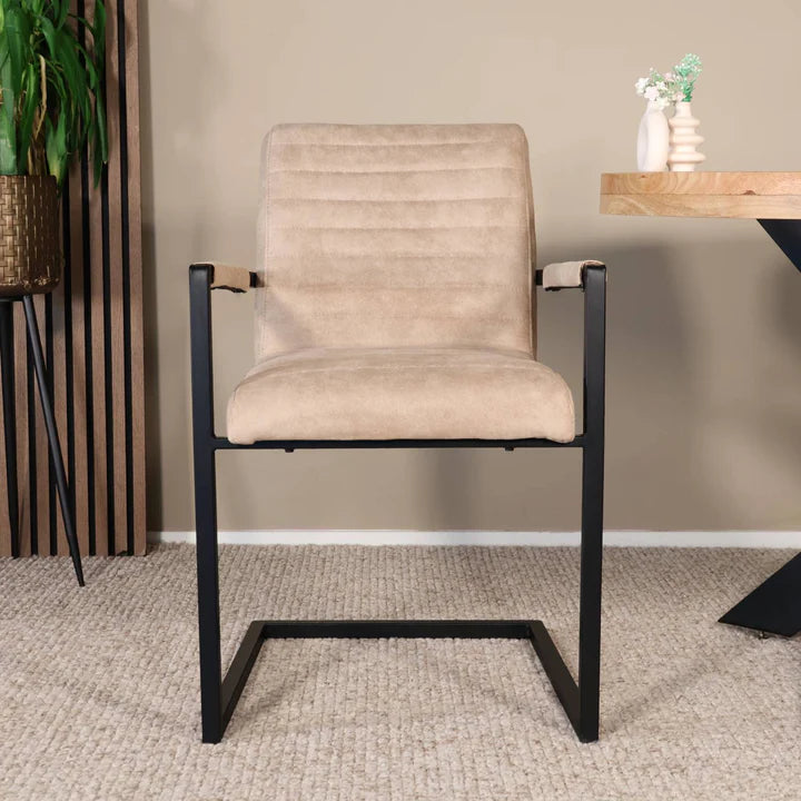 Deze moderne eetkamerstoel met armleuningen brengt comfort en elegantie samen aan tafel. De zachte stoffen bekleding voelt warm en luxe aan, terwijl het zwarte metalen frame zorgt voor een stoer contrast. Ideaal voor lange etentjes of gezellige borrelavonden, en moeiteloos te combineren met verschillende woonstijlen.