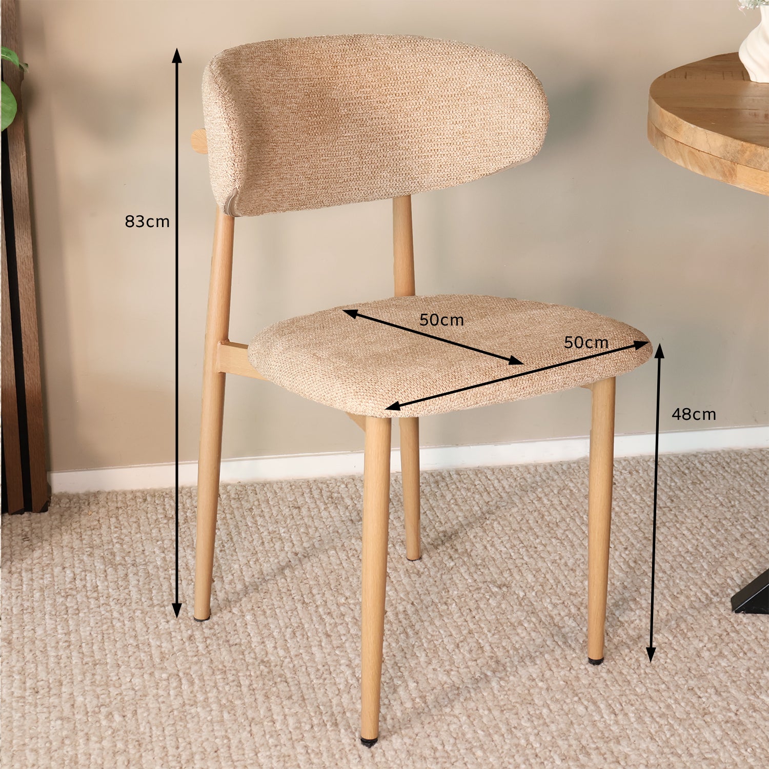 - Eetstoel van B 50 × D 50 × H 83 cm met een zithoogte van 48 cm