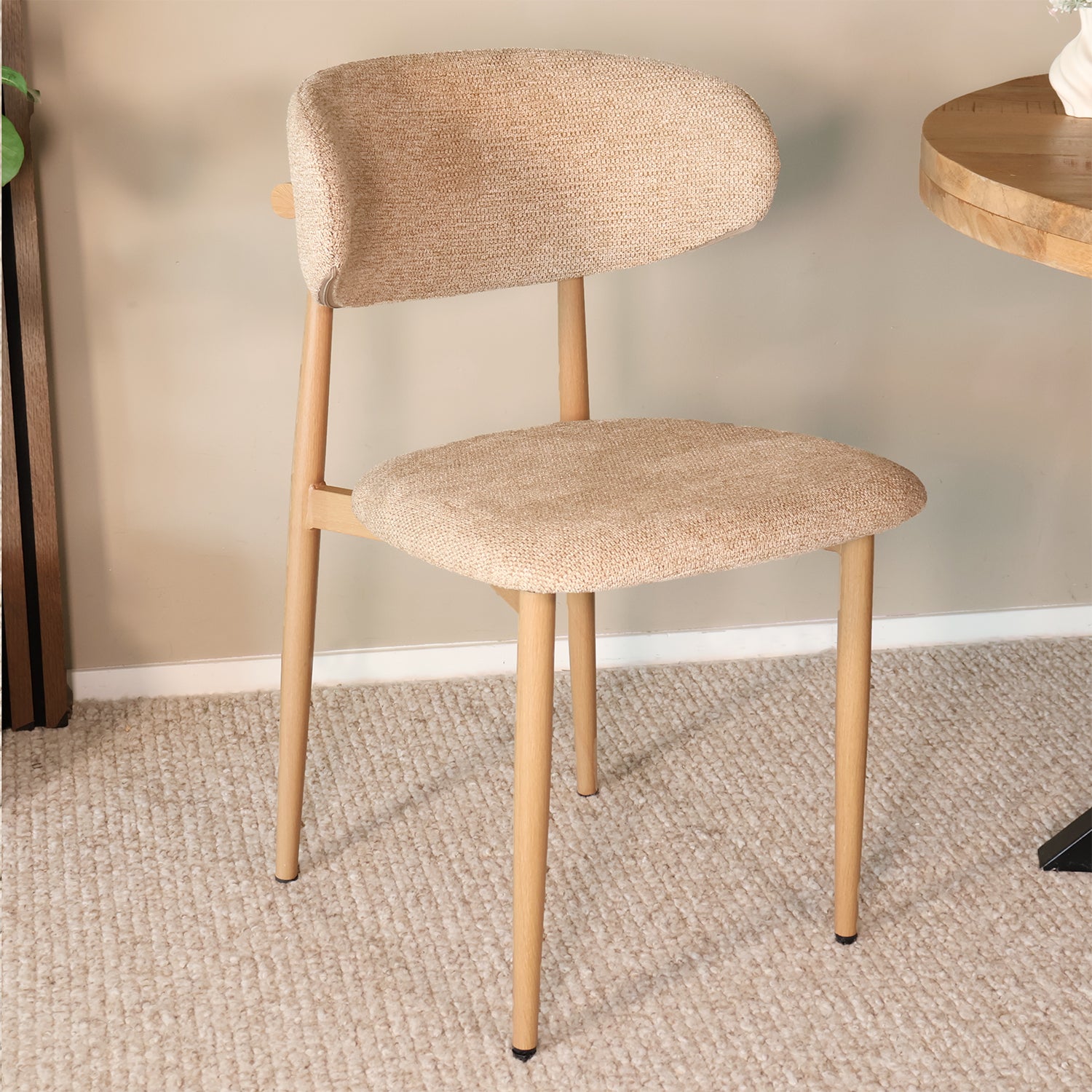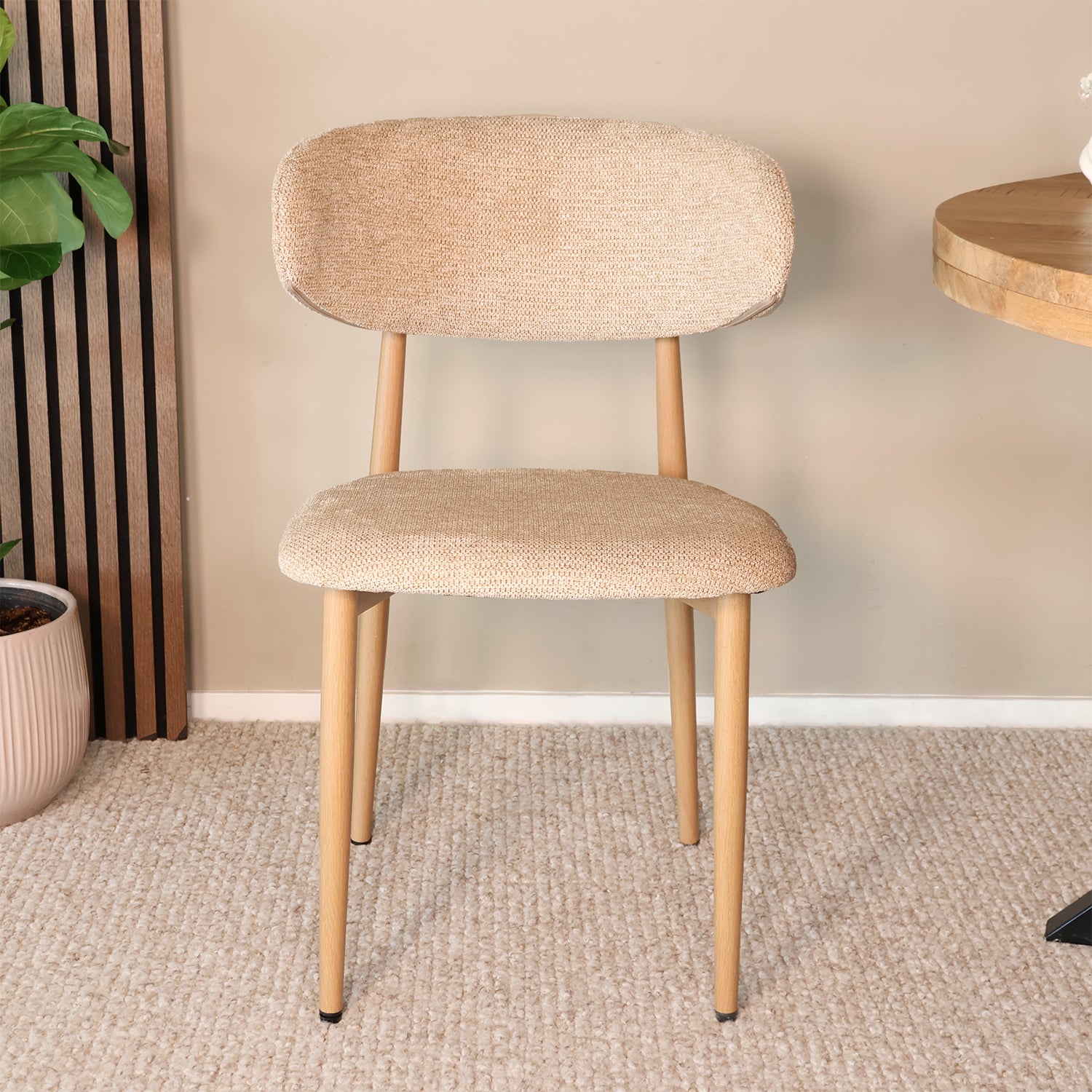Breng rust, warmte en elegantie in huis met deze eetkamerstoel in verfijnde Japandi-stijl. De combinatie van een zachte stoffen zitting en een natuurlijk houtlook onderstel zorgt voor een harmonieuze balans tussen modern comfort en minimalistisch design. Perfect voor lange diners, rustige ochtenden aan tafel of als stijlvolle accentstoel in je woonkamer.