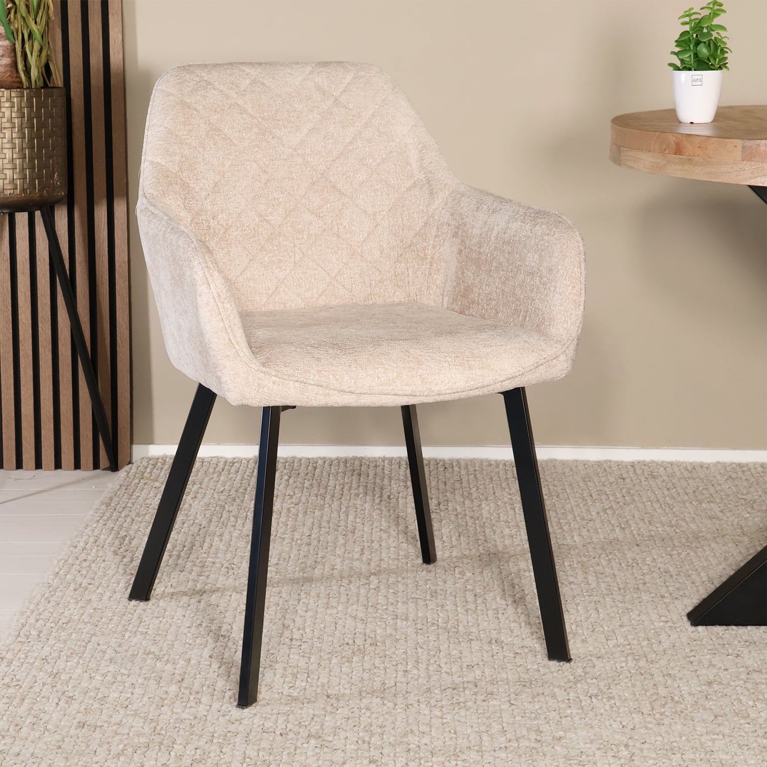Deze stoffen eetkamerstoel combineert elegantie en comfort op een verfijnde manier. De zachte chenille bekleding met subtiele glans voelt luxe aan, terwijl het metalen onderstel zorgt voor een moderne, luchtige uitstraling. Ideaal voor gezellige avonden tafelen of als stijlvolle eyecatcher in je woonkamer.