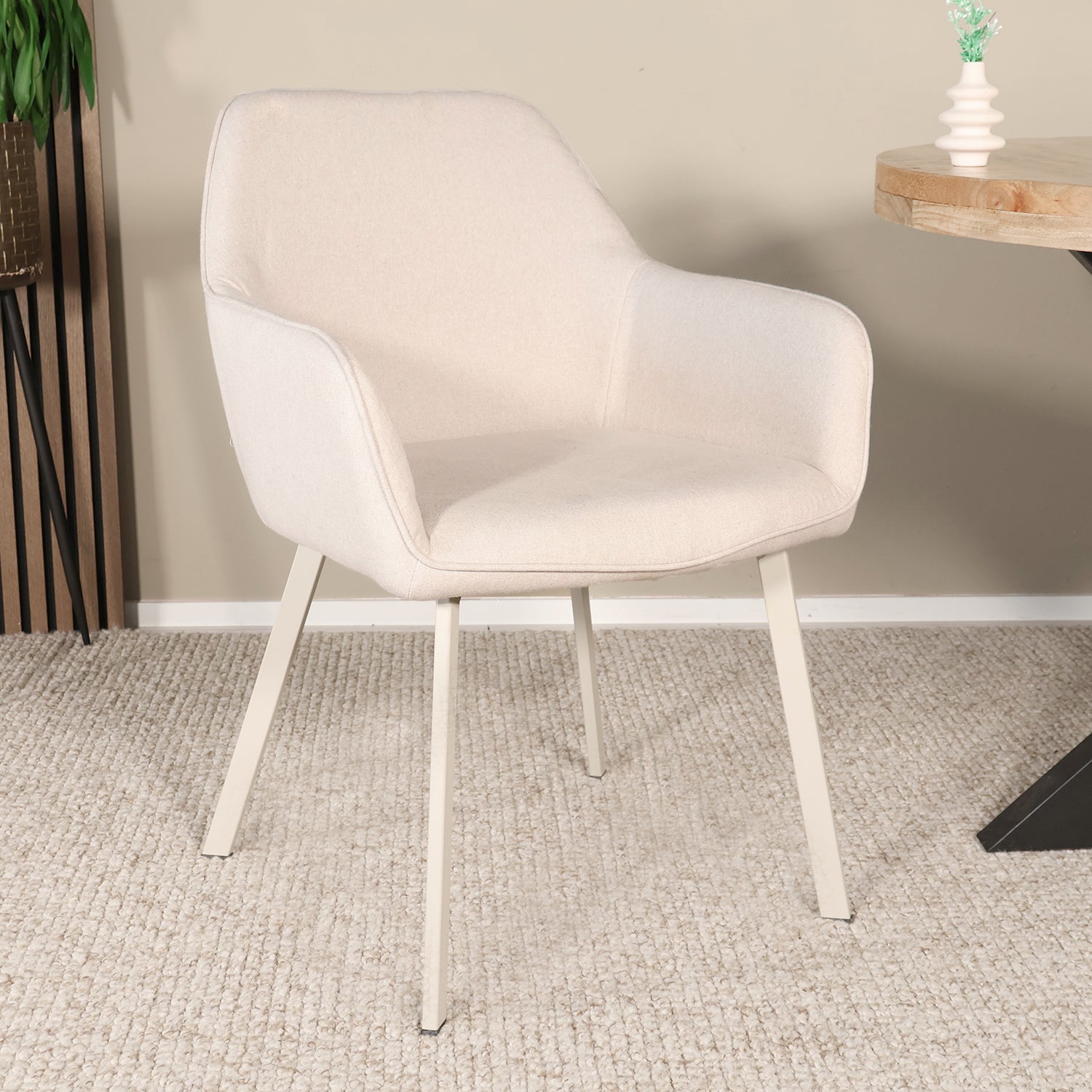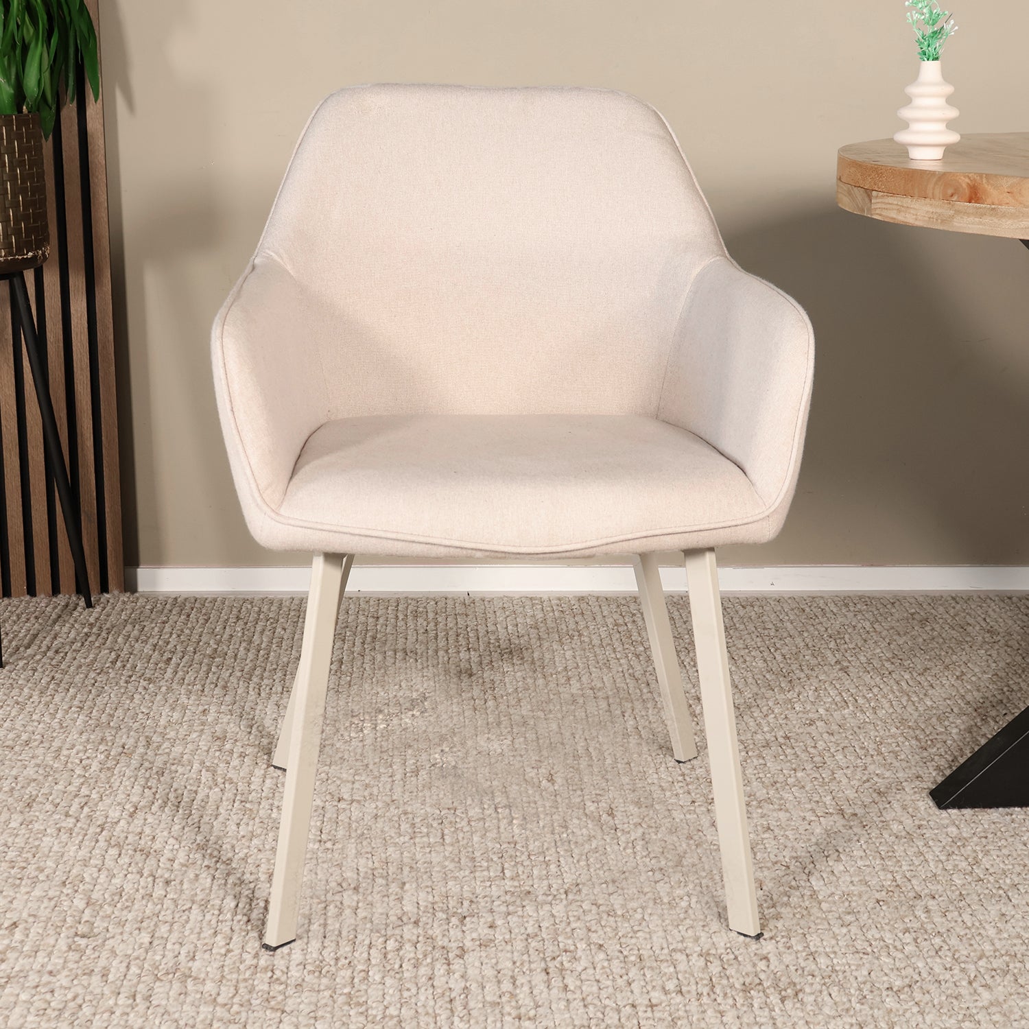 De eetkamerstoel Maris straalt luxueuze elegantie uit en is een klassieke eyecatcher in ieder interieur. De zitting is bekleed met linnen stof, wat de stoel een tijdloze uitstraling geeft. Het metalen beige onderstel voegt een industriële touch toe, waardoor de stoel perfect past in zowel moderne als stoere ruimtes. Of jij nu een knusse eethoek wilt creëren of een blikvanger zoekt voor je woonkamer, slaapkamer of studeerkamer, deze stoel is een veelzijdige keuze.