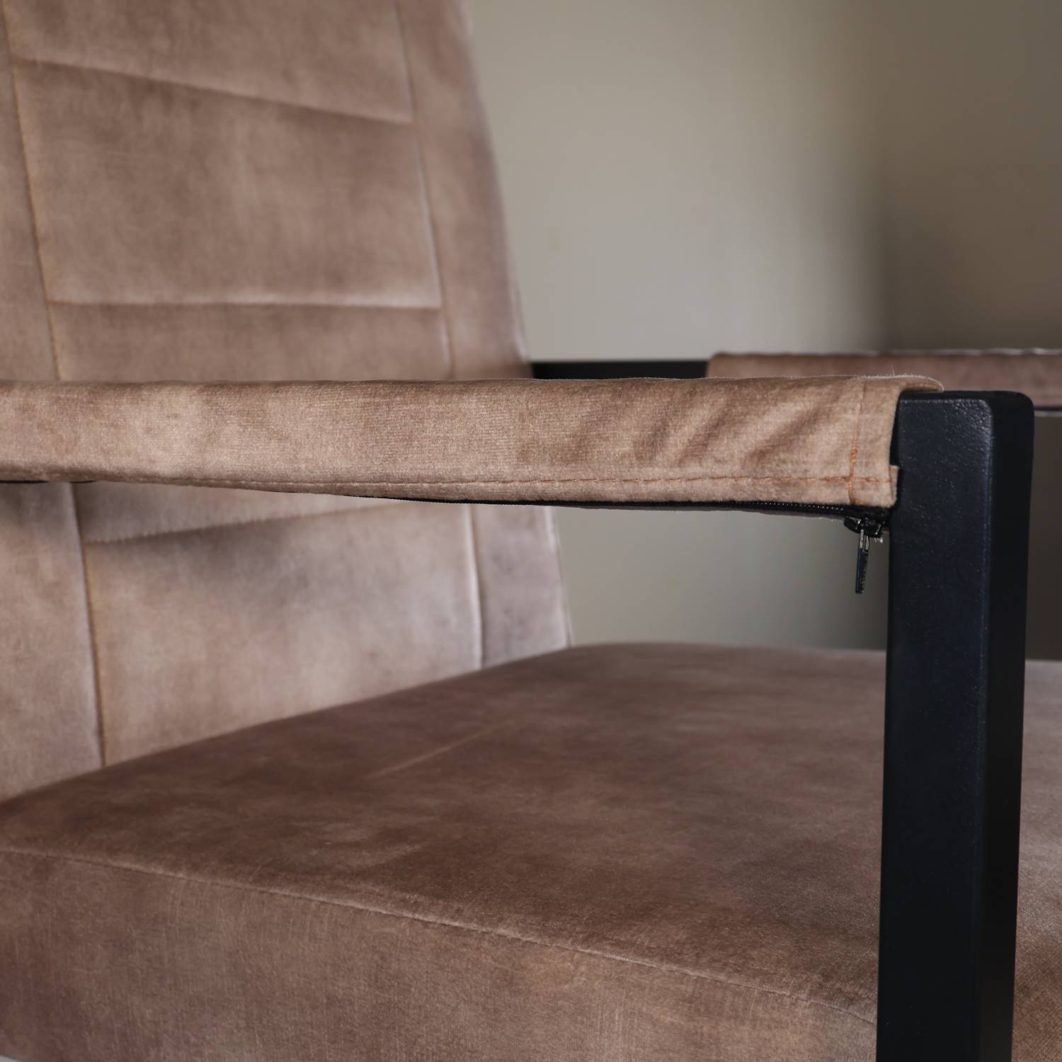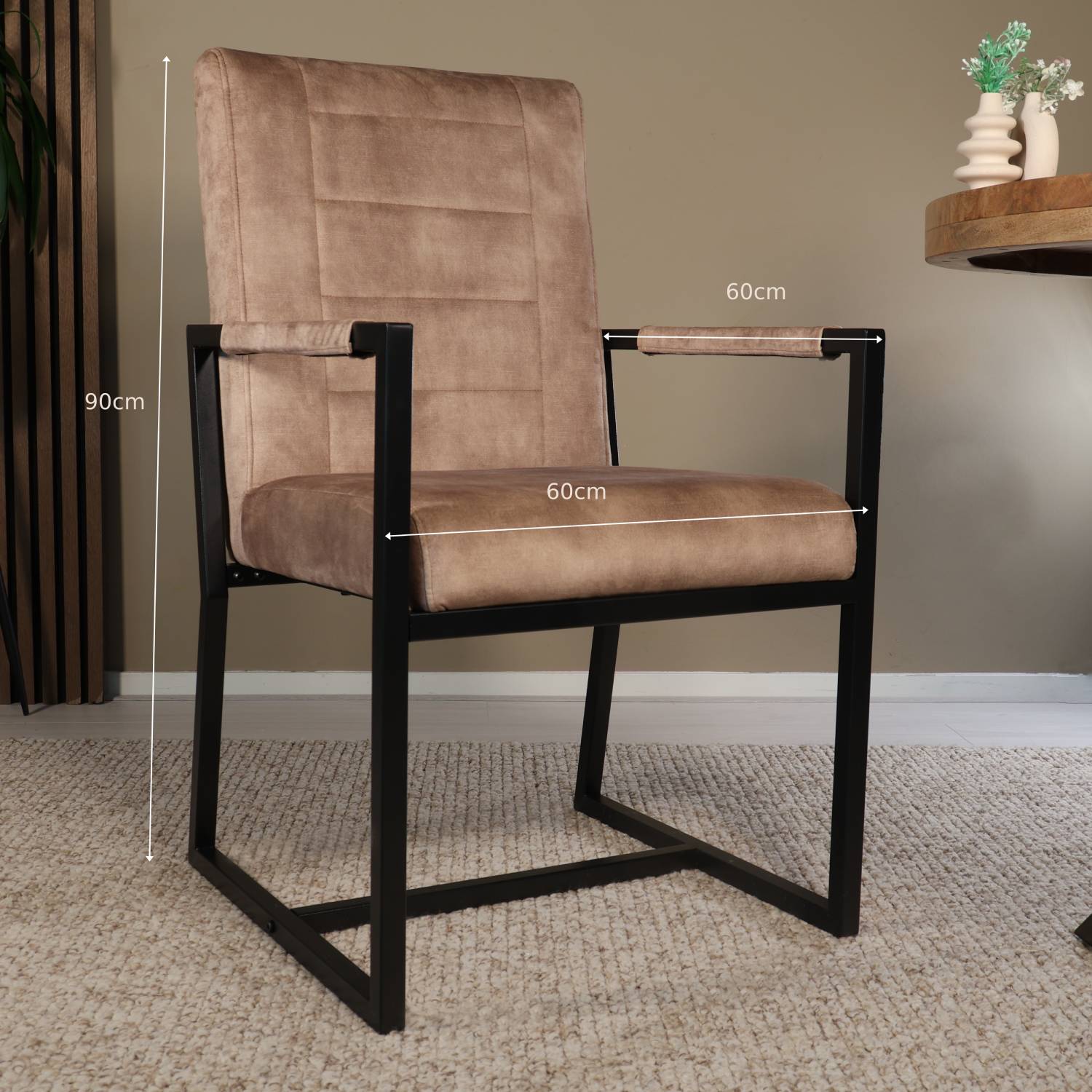 Elegant, comfortabel en functioneel – deze eetkamerstoel met armleuningen brengt moeiteloos stijl in je eetkamer. De zachte microvezel bekleding voelt aan als suède en zorgt voor een warme uitstraling, terwijl het zwarte metalen frame een stoer industrieel accent toevoegt. Perfect voor lange avonden aan tafel of om extra flair toe te voegen aan je interieur.