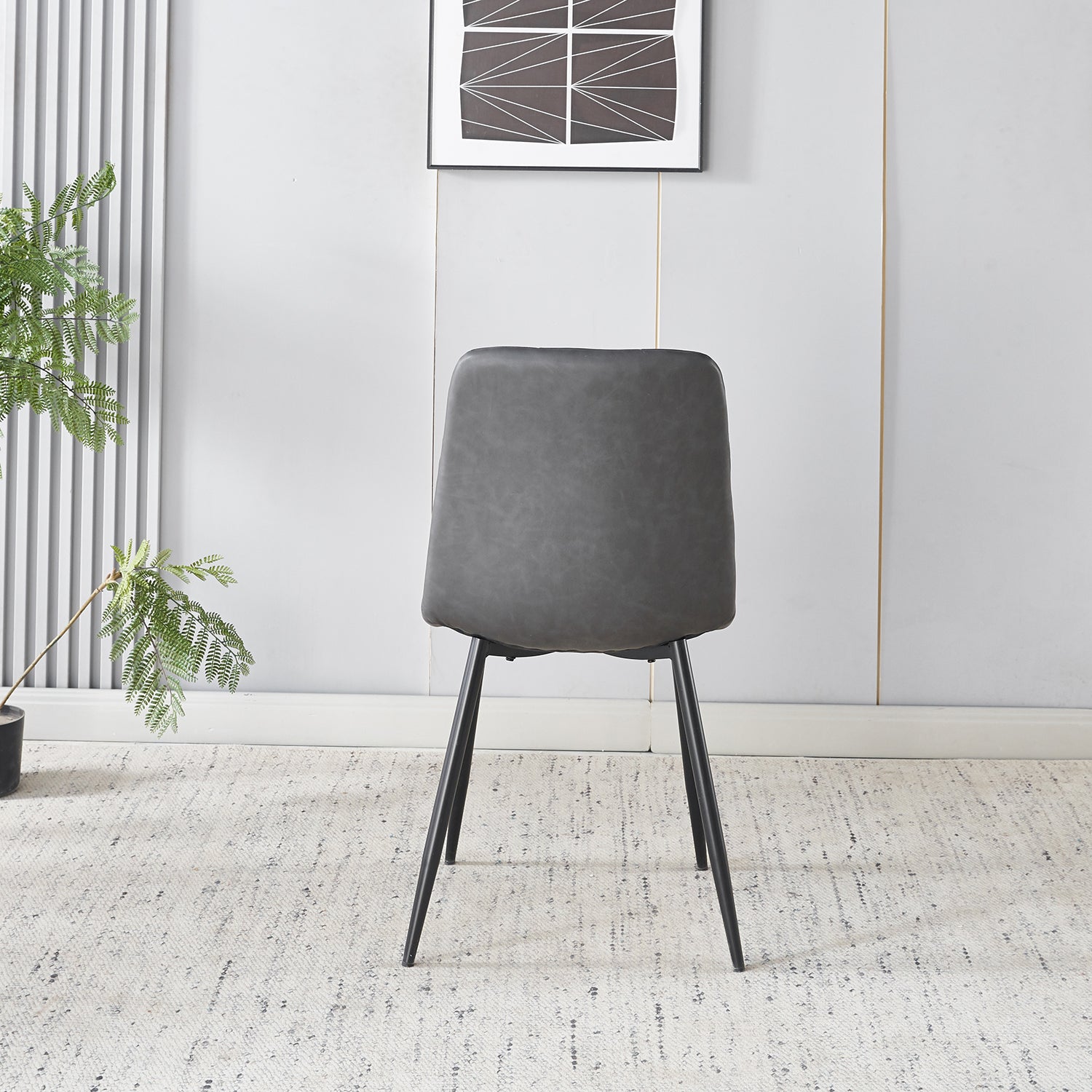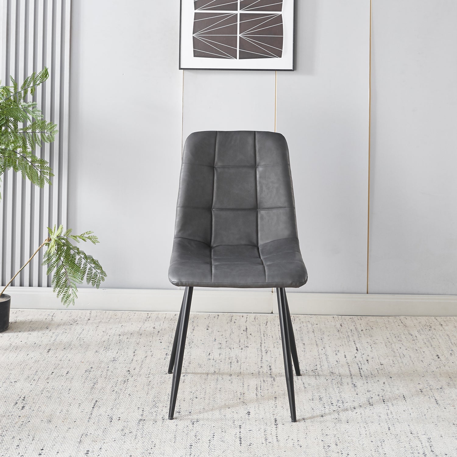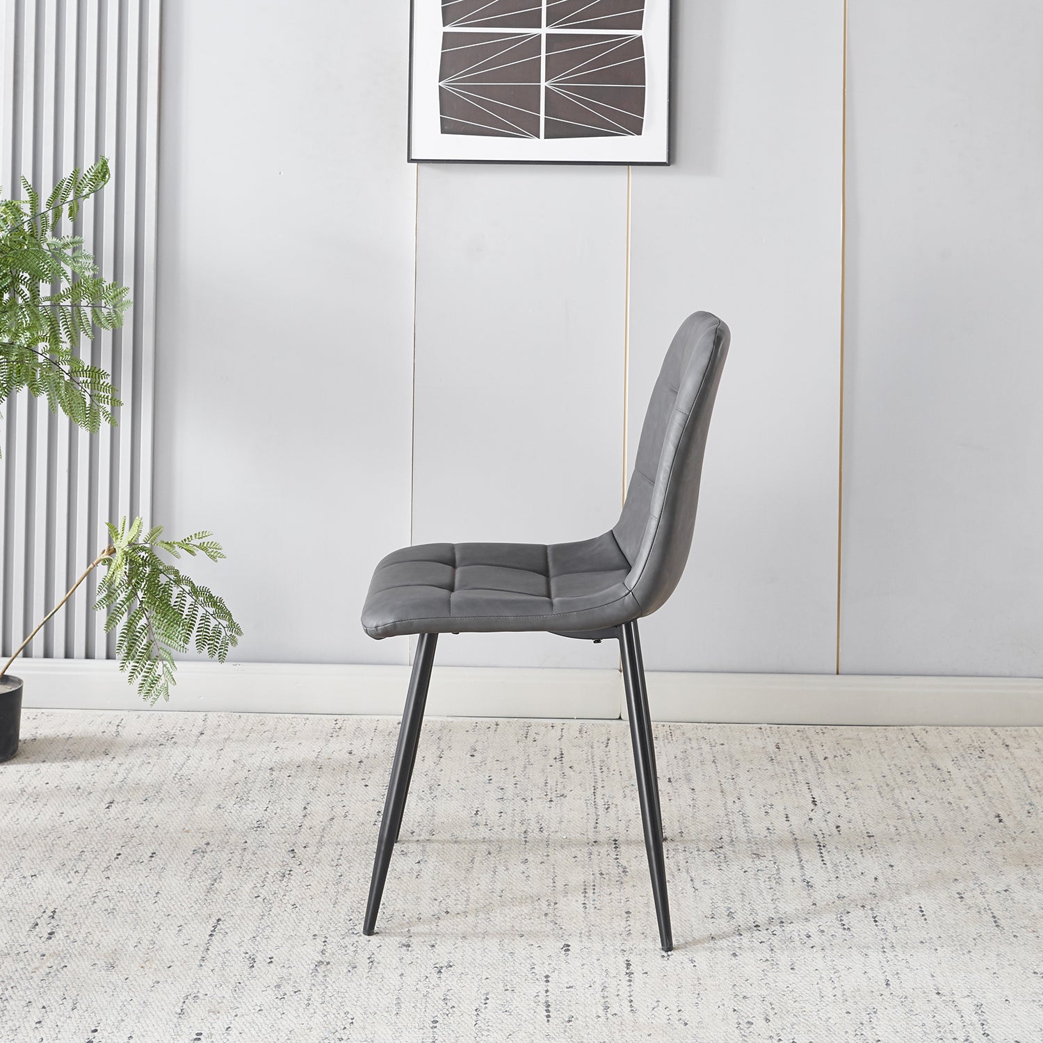 Deze elegante eetkamerstoel combineert stijl en comfort op een verfijnde manier. De zachte kunstleren bekleding met subtiel blokpatroon zorgt voor een luxueuze uitstraling, terwijl het metalen onderstel stevigheid en een modern karakter toevoegt. Perfect om comfortabel te tafelen of om extra zitplaatsen te creëren in je woonkamer of kantoorruimte.